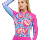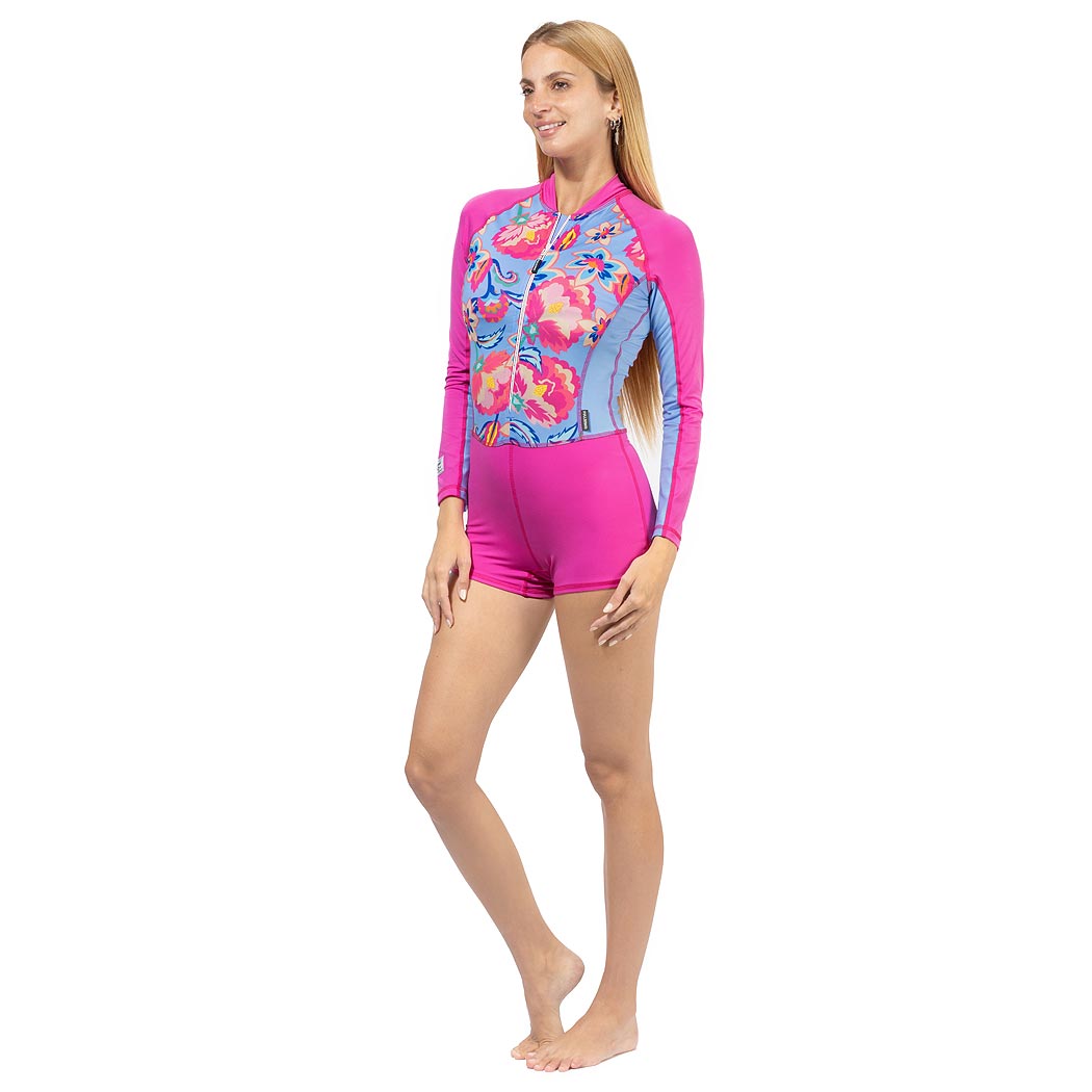Diseñado para la mujer activa, este body de manga larga y short corto ofrece corte ajustado, protección solar certificada UPF50+ y versatilidad para actividades acuáticas. Incluye cierre delantero blanco, estampado "Amazonas", cortes de contraste en mangas y costados, etiqueta TAB bordada, short con forro cachetero y soporte elástico interno para top, garantizando comodidad, estilo deportivo y seguridad UV. Fabricado en tejido técnico transpirable y de secado rápido, es ideal para entrenar, nadar o exponerse al sol con total confianza. ¡Rendimiento y diseño en una sola prenda!