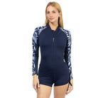 Este body para dama es la fusión perfecta entre funcionalidad, estilo y soporte, ideal para cualquier actividad al aire libre o acuática. Confeccionado en color marino con tela de secado rápido y certificado UPF50+ para máxima protección solar, presenta un corte ajustado que realza la figura y un short cachetero simulado con forro y elevadores con jareta para ajustar el largo en los costados. Incluye mangas largas con estampado Peciolo Lycra, costados en tela respirable para mayor frescura, y cierre frontal en tono marino para fácil uso. Su soporte de top con elástico interno proporciona mayor seguridad, mientras que la etiqueta TAB bordada con logo en el costado le da un toque distintivo y deportivo.