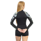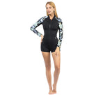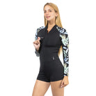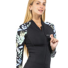 Body para dama en color negro, esta prenda es ideal para la playa o la alberca con cuello, mangas en parte inferior cuentan con tela respirable, desde los hombros y parte superior en tela sublimada con motivo Monstera, cuenta con cierre frontal, en parte interna de la cintura, cuenta con control abdominal para que acentues tu figura. Cuenta con forro interno al frente para mayor comodidad, en todas tus actividades, de tela fresca, ligera y suave esta prenda cuenta con nuestra recomendación UPF50+ que mantendrá tu piel protegida de los rayos solares, de secado ultra rápido, esta prenda tampoco guarda olores