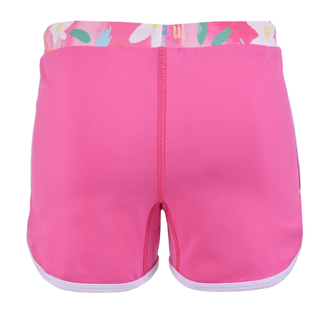 Para los días de vacaciones o de paseos por la playa y los juegos en la alberca, te presentamos para tu hija este lindo boxer liso, en color rosa, con pretina en tela sublimada multicolor, motivo floral charm, con jareta en cintura para un mayor ajuste y las orillas en color blan co, con etiqueta tab bordada de nuestra f irma en pretina, esta prenda tiene la certificación UPF50+ que mantendrá la piel de tu pequeña protegida de los rayos solares. Confeccionada de tela fresca y suave, recomendada para actividades acuáticas, de secado ultra rápido que no guarda olores