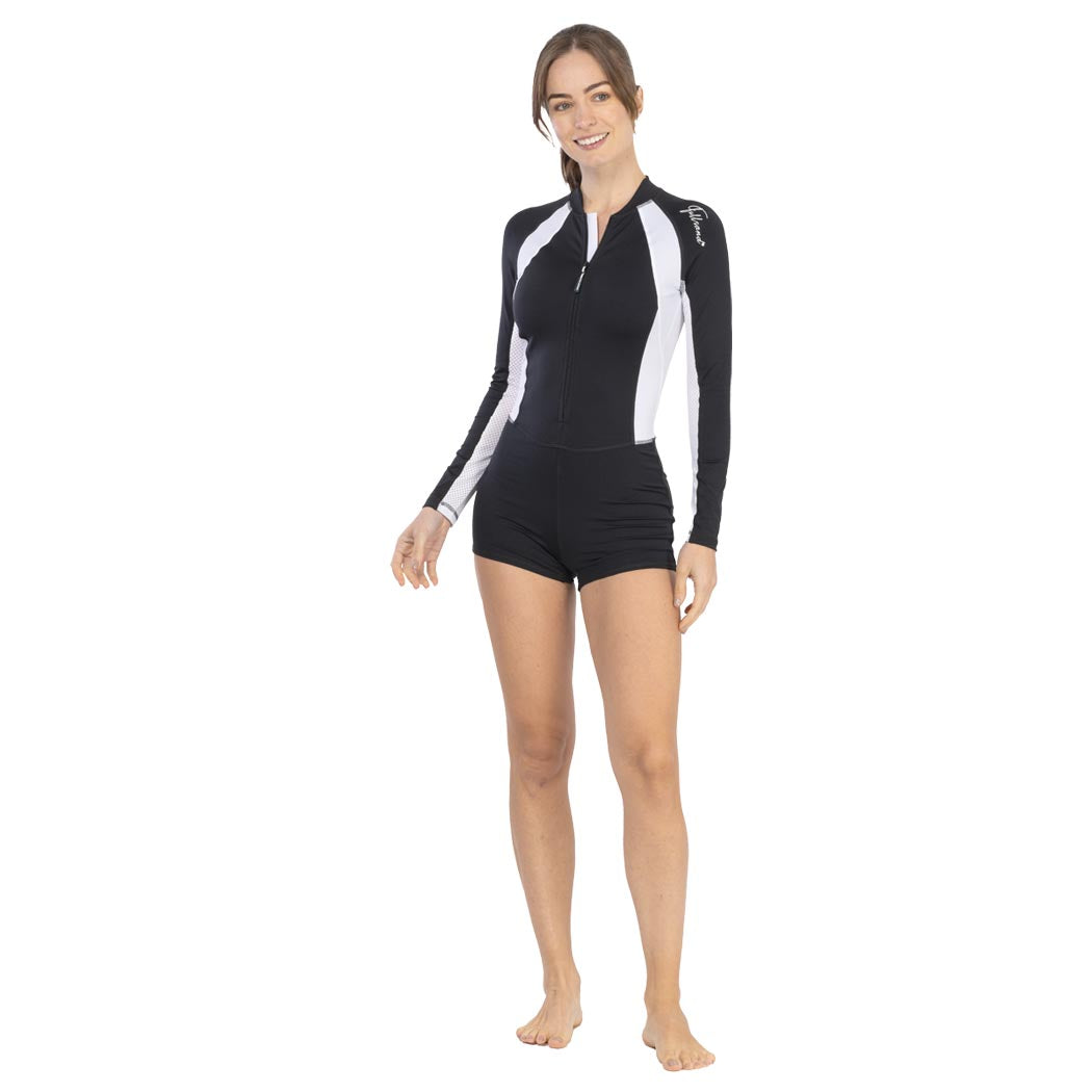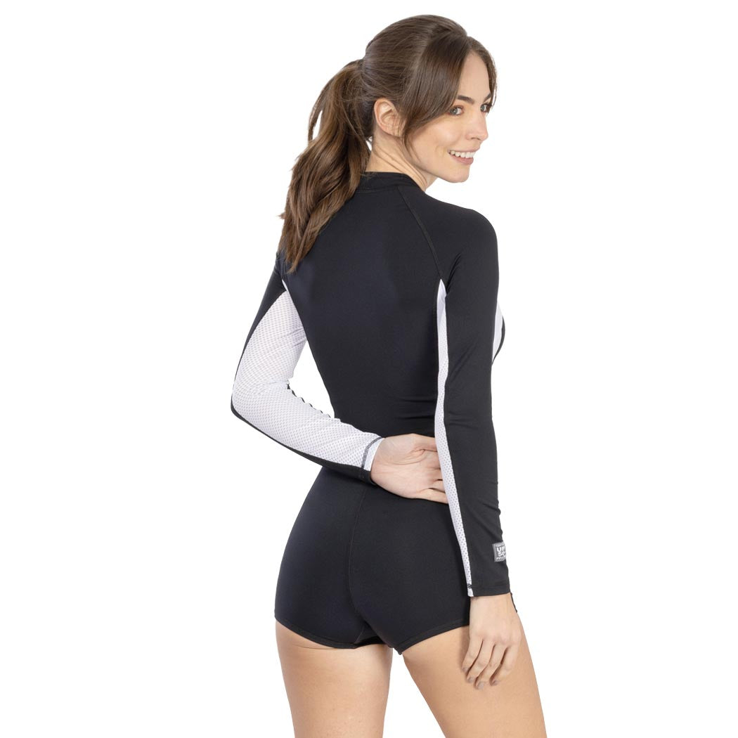Diseñado para máxima comodidad y rendimiento, este body de manga larga y short corto ofrece un corte ajustado que se adapta a tu silueta. Fabricado con materiales de alta calidad y certificado UPF 50+, es ideal para actividades al aire libre y acuáticas. Incluye detalles funcionales como cierres frontales en color negro, cortes en costados con contraste y mangas con paneles respirables para mayor frescura. El short cachetero simulado con forro y el soporte de top con elástico interno brindan seguridad y comodidad. Con un logo estampado en el hombro izquierdo, este body en color negro combina estilo y funcionalidad para que te sientas segura y elegante en cualquier ocasión. ¡Activa tu día con confianza!