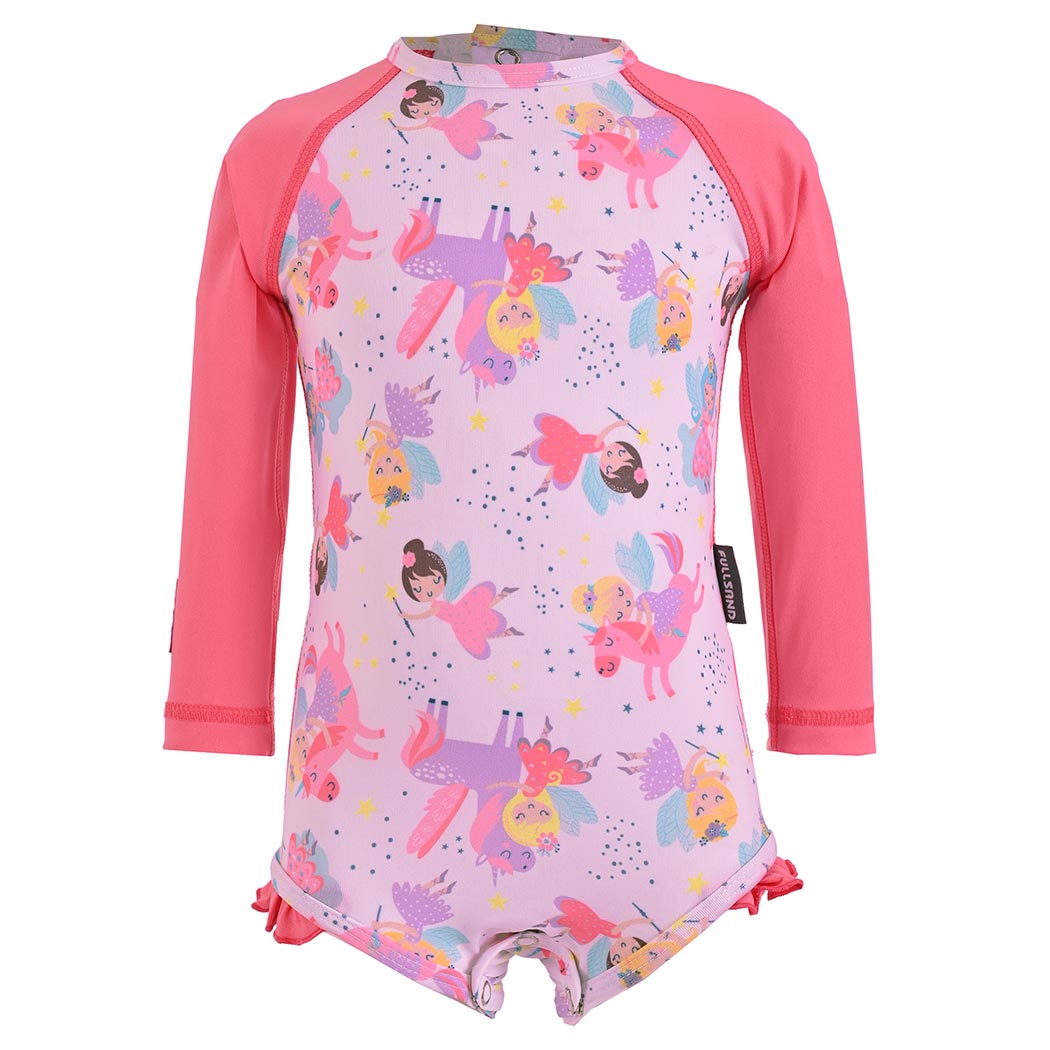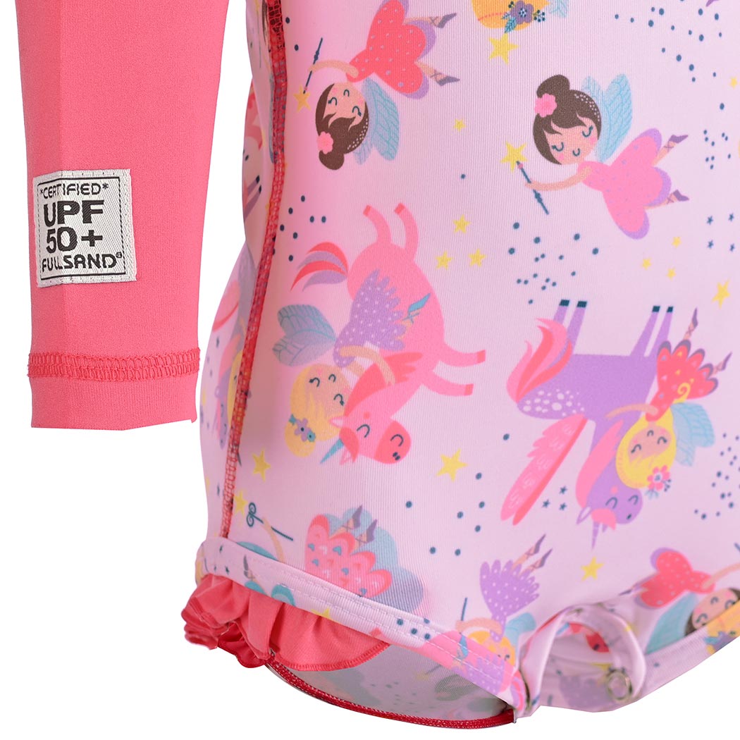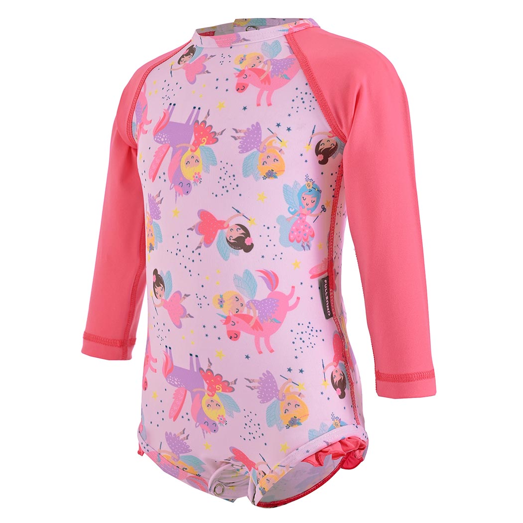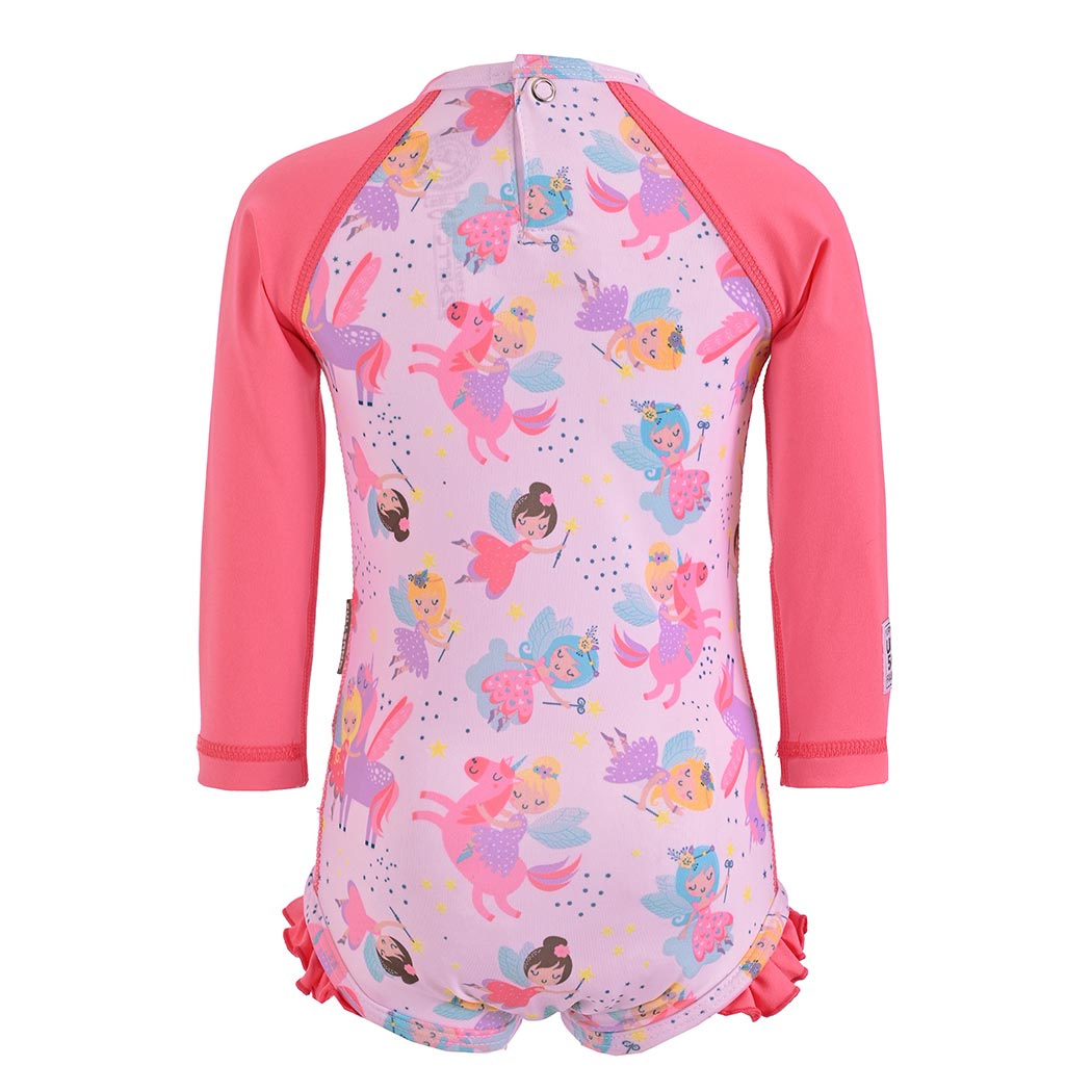 Protege a tu bebé con estilo con nuestra wet swim para niña, una prenda de manga larga y corte ajustado diseñada para cualquier actividad al aire libre o en el agua. Confeccionada en tela de secado rápido y certificada con protección solar UPF50+, garantiza comodidad y seguridad bajo el sol. Su encantador diseño incluye estampado de hadas en el delantero, espalda y calzón, con mangas y cuello en tela lisa para un contraste delicado. Los olanes en las piernas añaden un toque dulce, y los broches en la entrepierna junto con la aletilla trasera facilitan el cambio. Incluye etiqueta TAB con logo bordado en el costado. Disponible en tallas de 12 a 24 meses.