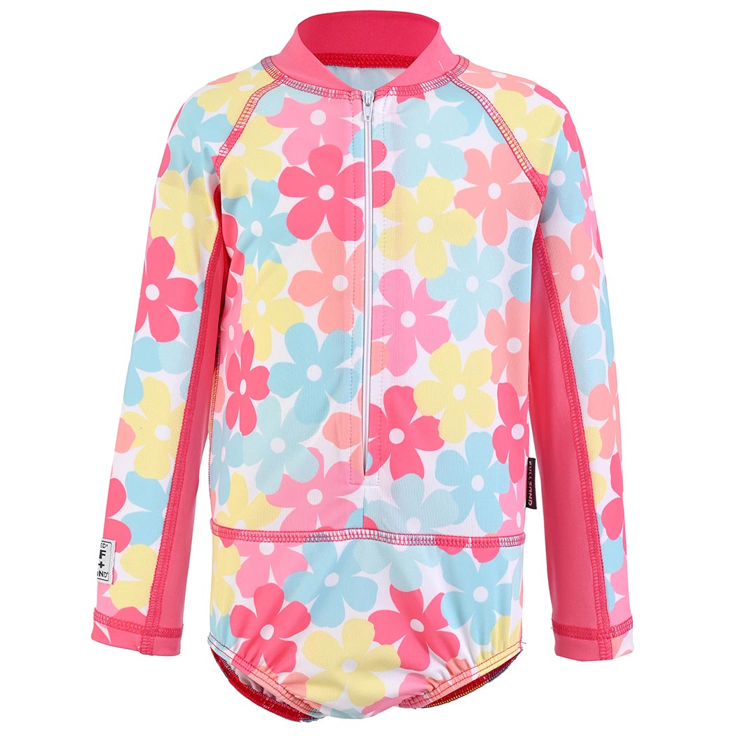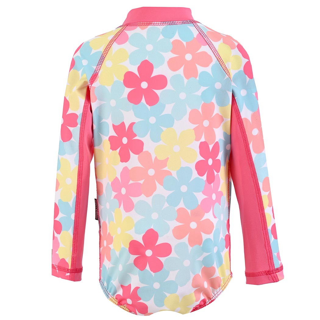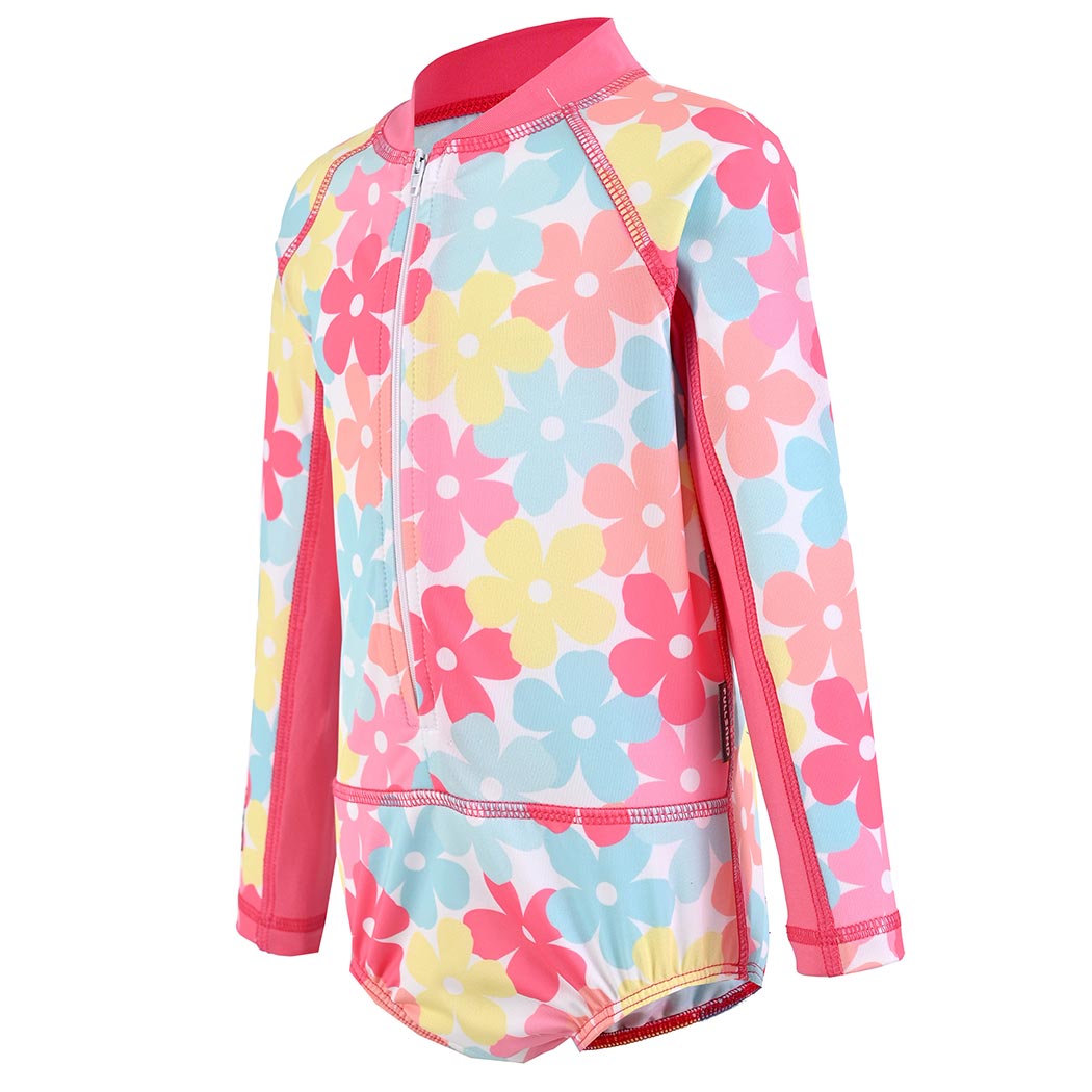 Para que tu hija luzca super coqueta y disfrute en grande las vacaiones en la playa o la alberca bajo el sol, te presentamos esta Wetswim, multicolor en tela sublimada motivo campestre, con cuello y mangas inferiores en color salmón, esta prenda cuenta con cierre frontal y botones en la entrepierna, para un cambio mas eficiente del pañal, esta confeccionado de tela fresca, suave y ligera, de secado ultra rápido, que cuen ta con nuestra certificación UPF50+ para cuidar la piel de tu hija de los rayos dañinos UV.