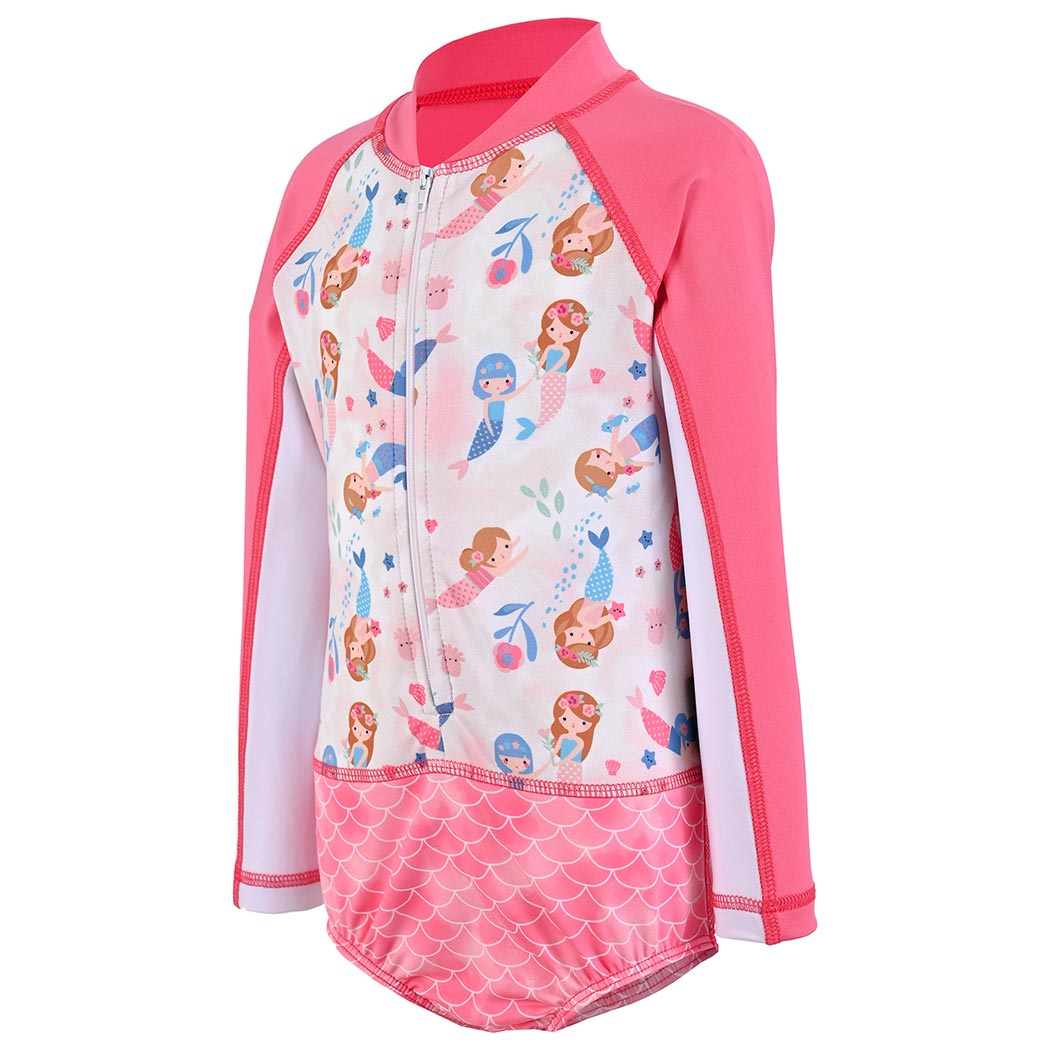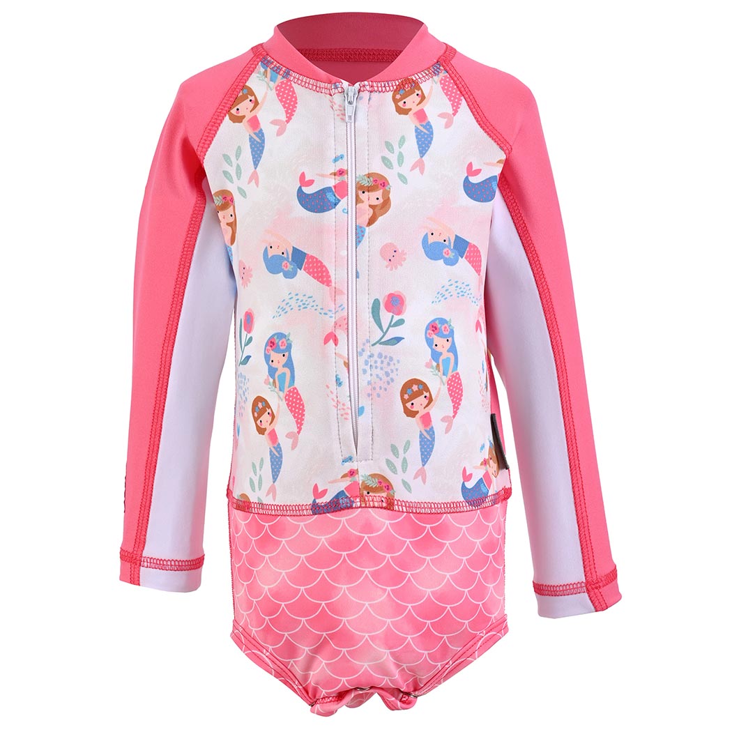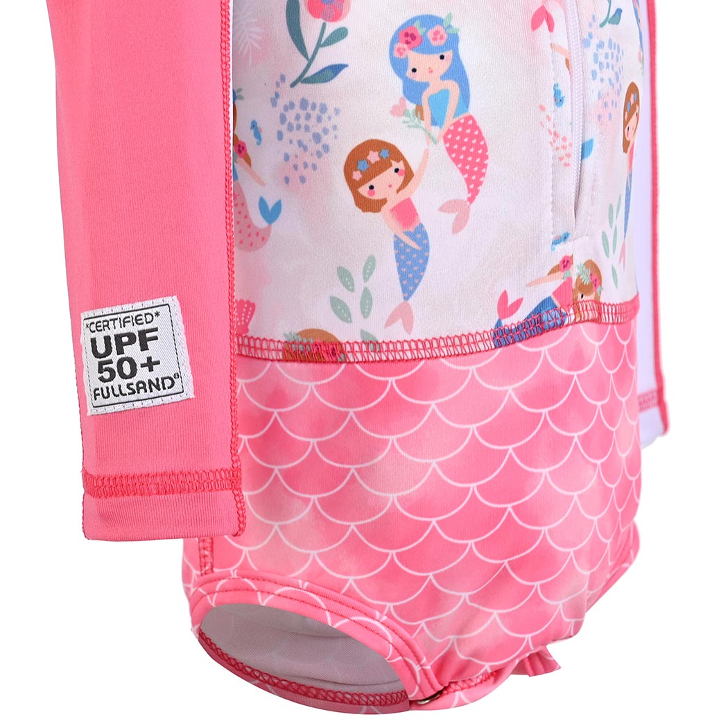 Este encantador pañalero para bebé niña es perfecto para actividades al aire libre y acuáticas. Cuenta con protección solar certificada UPF50+ y tela de secado rápido, ideal para cuidar su piel mientras se divierte. Tiene un diseño de manga larga con corte ajustado y cierre frontal en color blanco para facilitar el cambio. El estampado de sirenas adorna el frente y los costados de las mangas, mientras que el calzón simulado luce un diseño de escamitas adorable. Las mangas, cuello y aletilla están confeccionadas en tela lisa para un look equilibrado. Incluye detalle de olan en la cintura, broches en la entrepierna para mayor practicidad, y etiqueta TAB bordada con el logo en el costado izquierdo.