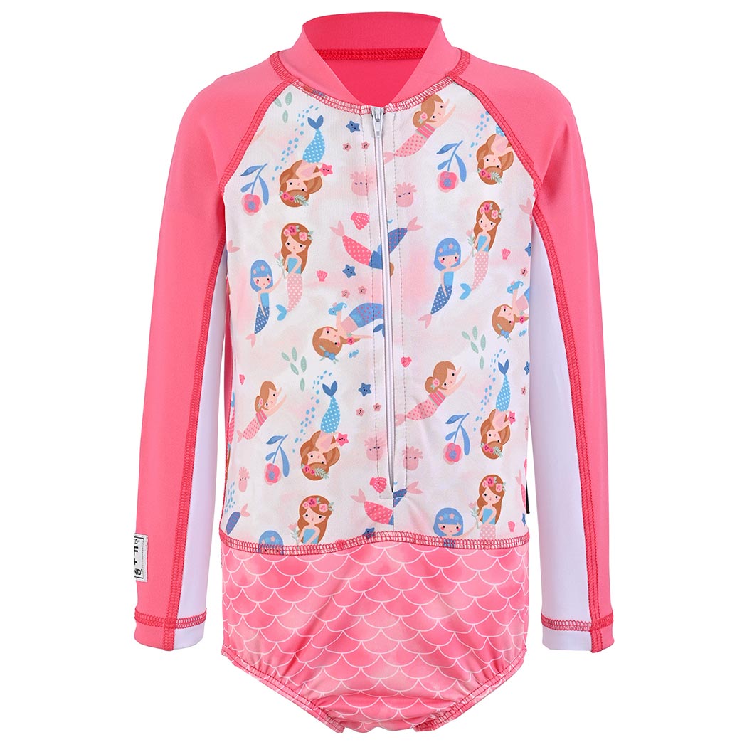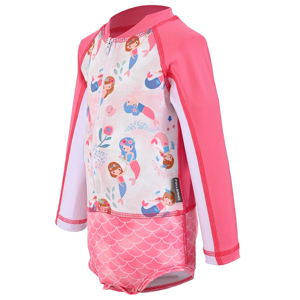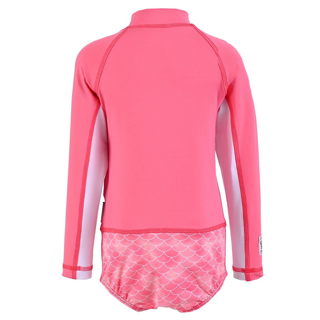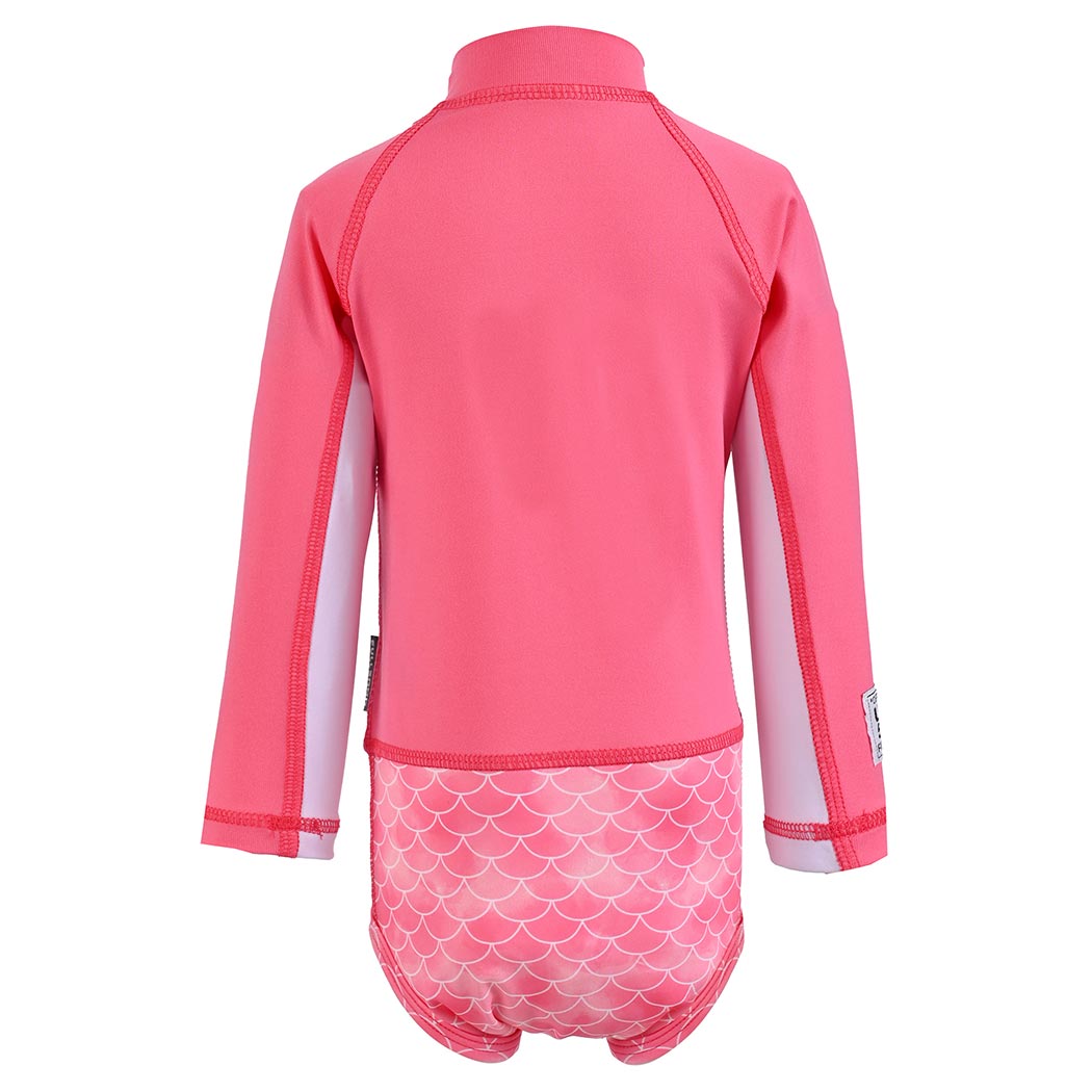Este encantador pañalero para bebé niña es perfecto para actividades al aire libre y acuáticas. Cuenta con protección solar certificada UPF50+ y tela de secado rápido, ideal para cuidar su piel mientras se divierte. Tiene un diseño de manga larga con corte ajustado y cierre frontal en color blanco para facilitar el cambio. El estampado de sirenas adorna el frente y los costados de las mangas, mientras que el calzón simulado luce un diseño de escamitas adorable. Las mangas, cuello y aletilla están confeccionadas en tela lisa para un look equilibrado. Incluye detalle de olan en la cintura, broches en la entrepierna para mayor practicidad, y etiqueta TAB bordada con el logo en el costado izquierdo.