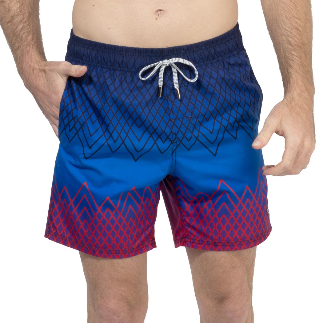 Disfruta tus vacaciones con el estilo y funcionalidad del traje de baño para hombre tipo bermuda, ideal para la playa o la piscina. Confeccionado en tela de secado rápido, cuenta con pretina elástica, jareta ajustable con puntas metálicas y calzón interno de tela calada que brinda comodidad durante todo el día. Su diseño incluye bolsas laterales, bolsa trasera con velcro y ojillo de drenado, y una bolsa interna oculta para mayor practicidad. El estampado “Frecuencia” en rojo resalta sobre el tono azul rey, y el detalle de cinta en la pretina trasera permite colgarlo fácilmente. Un traje de baño versátil, funcional y perfecto para tus días de sol y agua.