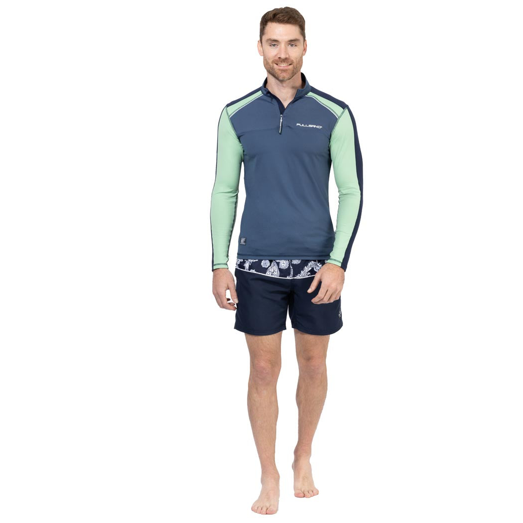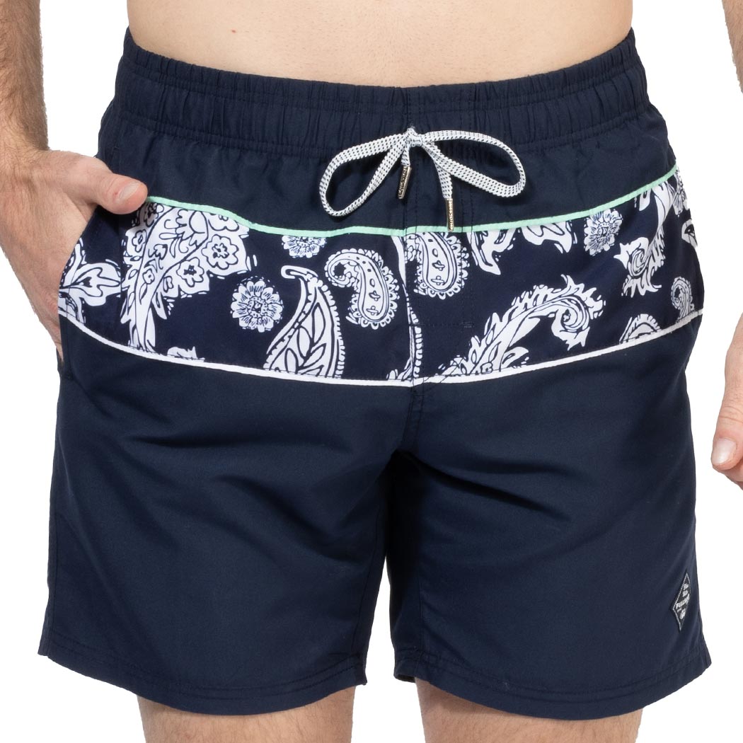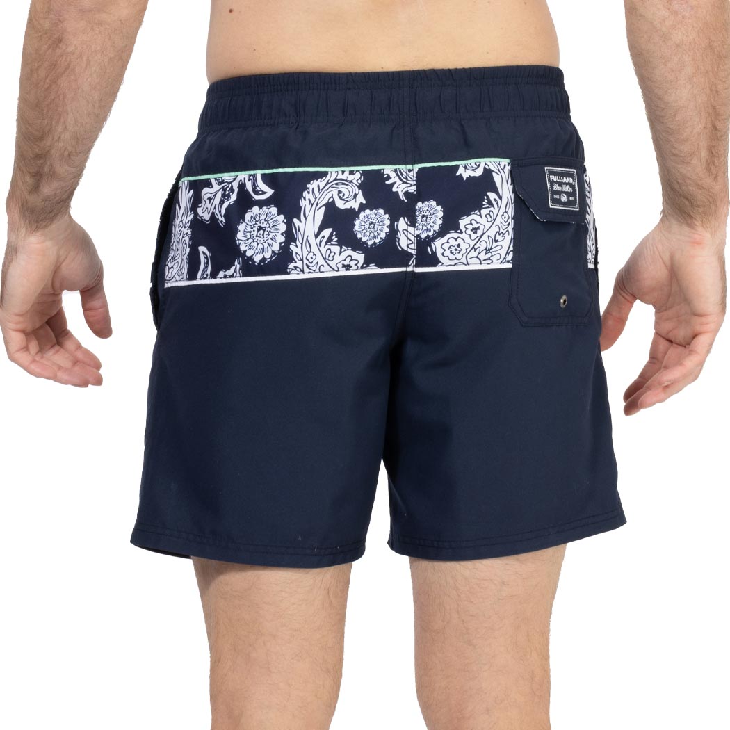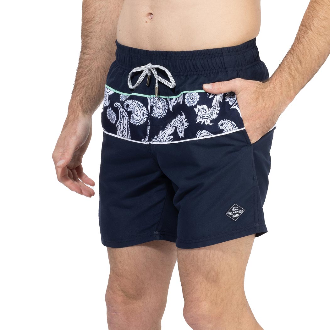 Bermuda para caballero, color marino con franja horizontal sublimada motivo Paisley, con jaretas en cintura y detalles vivos en color blanco y verde seco, con etiqueta bordada en pierna izquierda de nuestra firma Fullsand®, bosas laterales y bolsa trasera con perforación para drenar el agua, cuenta en interior con calzón de tela calada para un mayor soporte y comodidad en todas tus actividades. De tela fresca, suave y ligera de secado ultra rápido, además cuenta con nuestra recomendación UPF50+ que mantendrá tu piel protegida de los rayos solares.