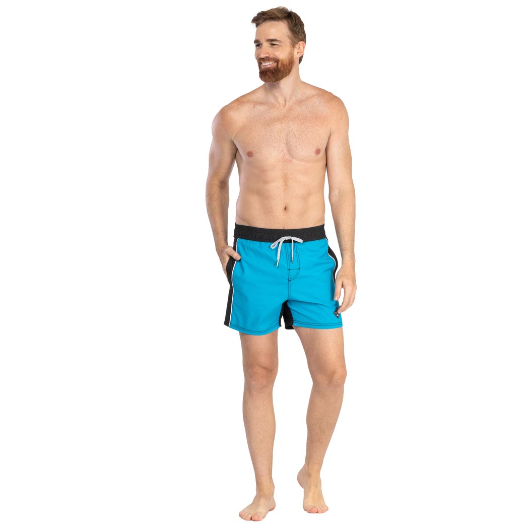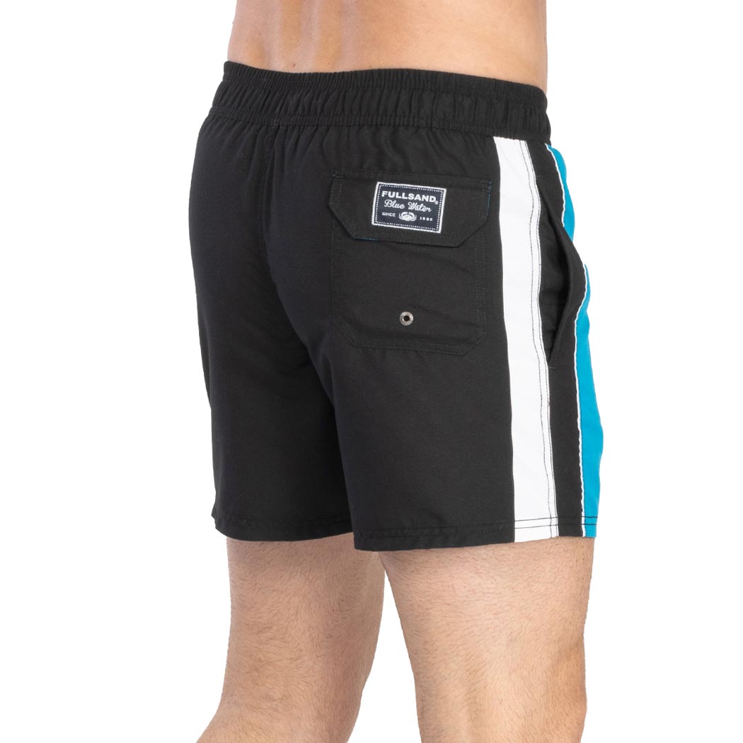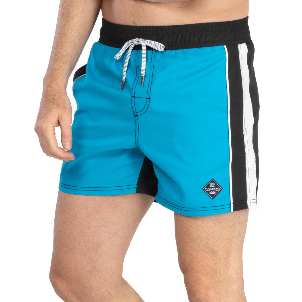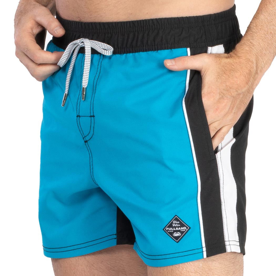 Short para caballero, en color ultramar de franjas y líneas en los costados en color blanco y negro, con resorte en pretina y jaretas en cintura, con etiqueta bordada en pierna izquierda de nuestra firma Fullsand®, con bosas laterales y bolsa en parte trasera con perforación para drenar el agua, cuenta en el interior con calzón de tela calada para un mayor soporte y comodidad en todas tus actividades. De tela fresca, suave y ligera de secado ultra rápido, que no guarda olores, además cuenta con nuestra recomendación UPF50+ que mantendrá tu piel protegida de los rayos solares.