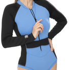 ¡Brilla en el agua con total protección! Traje de baño completo bodyswim para mujer de manga larga en perry liso certificado con UPF50+. Corte ajustado al cuerpo con secado rápido, perfecto para playa, piscina y actividades acuáticas. Etiqueta TAB bordada con logo en costado, cortes horizontales al frente en contraste, cierre frontal negro y cortes de costado en color contraste. Soporte de top con elástico interno proporciona máxima estabilidad. ¡Defensa solar con look dinámico!