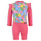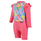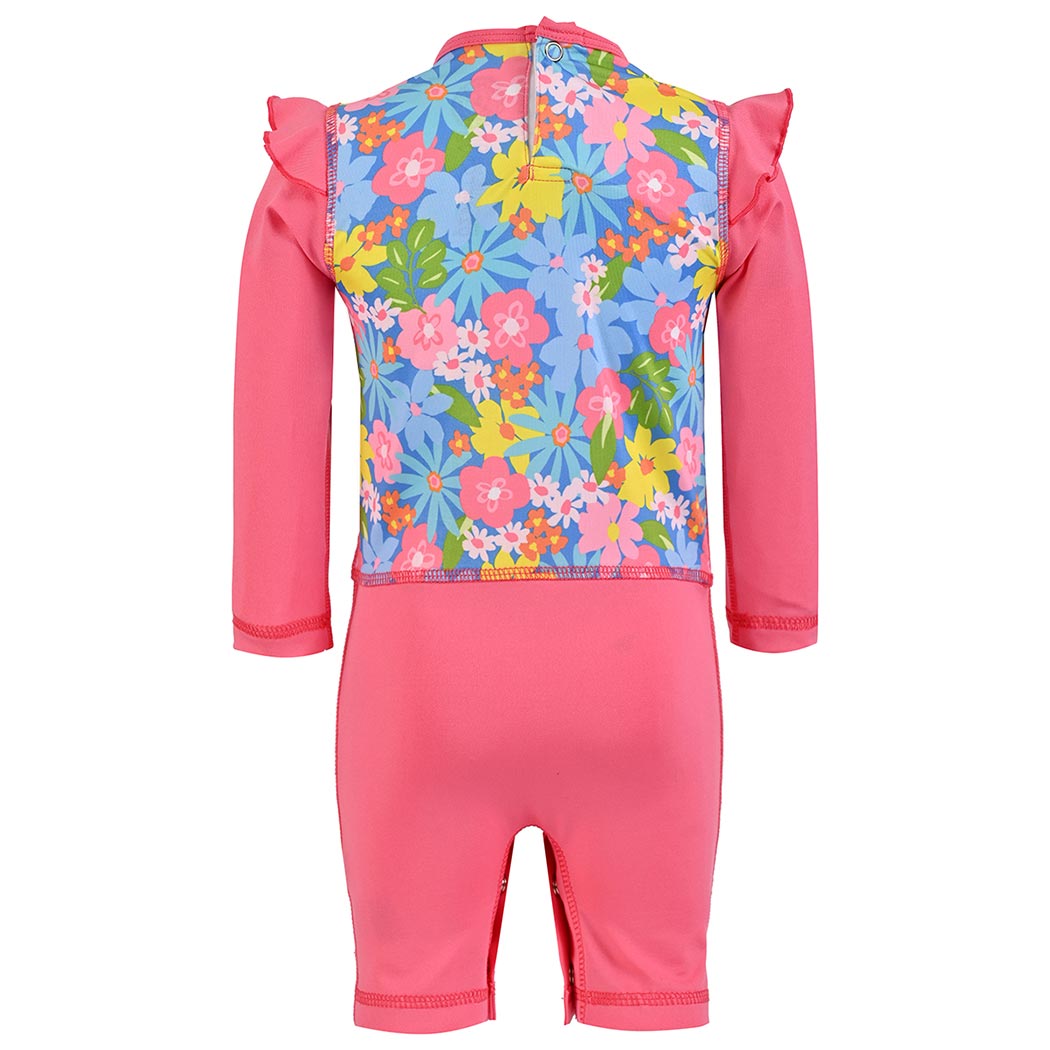 Traje de baño completo para bebé niña con protección solar UPF50+ certificada que cuida la piel delicada bajo el sol. Presenta un hermoso estampado Jardín Celeste en el frente y espalda, con detalles de olán en las mangas para un toque delicado. Mangas, short y cuello en tela lisa, corte de short simulado y broches de cierre en la entrepierna para cambios rápidos y cómodos. Aletilla con broche en el escote trasero para mayor seguridad. Etiqueta TAB bordada en el costado izquierdo. Tela de secado rápido perfecta para piscina, playa y diversión sin límites.