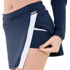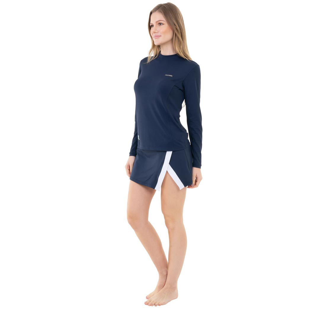 Combina estilo y protección en una sola prenda. Esta falda skort en color marino, ofrece cobertura UPF50+ para resguardar tu piel de los rayos solares mientras disfrutas de la playa, alberca o actividades al aire libre. Diseño en línea A con short de lycra integrado, secado rápido y cintura ajustable con jareta interna. Detalle exclusivo: abertura en la pierna izquierda con franjas en contraste y etiqueta TAB bordada en la pretina. Perfecta para quien busca confort, movimiento libre y protección solar sin compromisos.