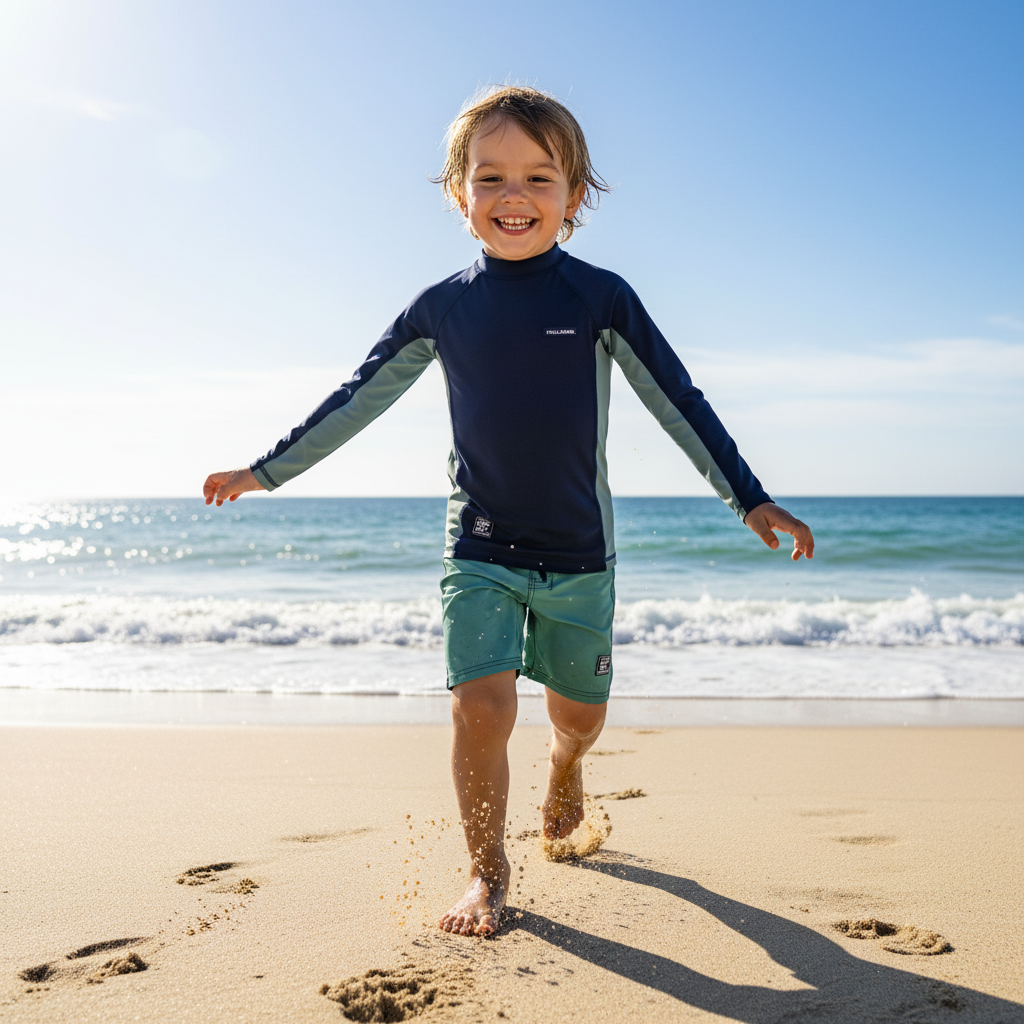 Seguridad solar y diversión garantizadas con esta playera rashguard de manga larga UPF50+ certificada. Secado rápido y diseño funcional la hacen indispensable para piscina, playa y aventuras al aire libre. Los costados del cuerpo y mangas en color contraste le dan ese look deportivo que los niños adoran, mientras que la etiqueta bordada con logotipo en el pecho izquierdo completa el estilo. Cómoda, duradera y lista para proteger a tu hijo durante todas sus actividades acuáticas bajo el sol.