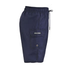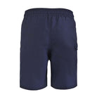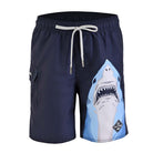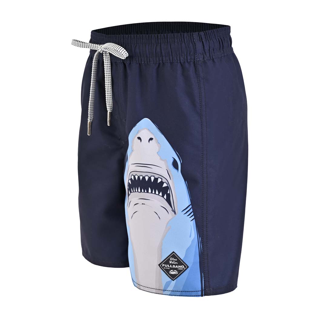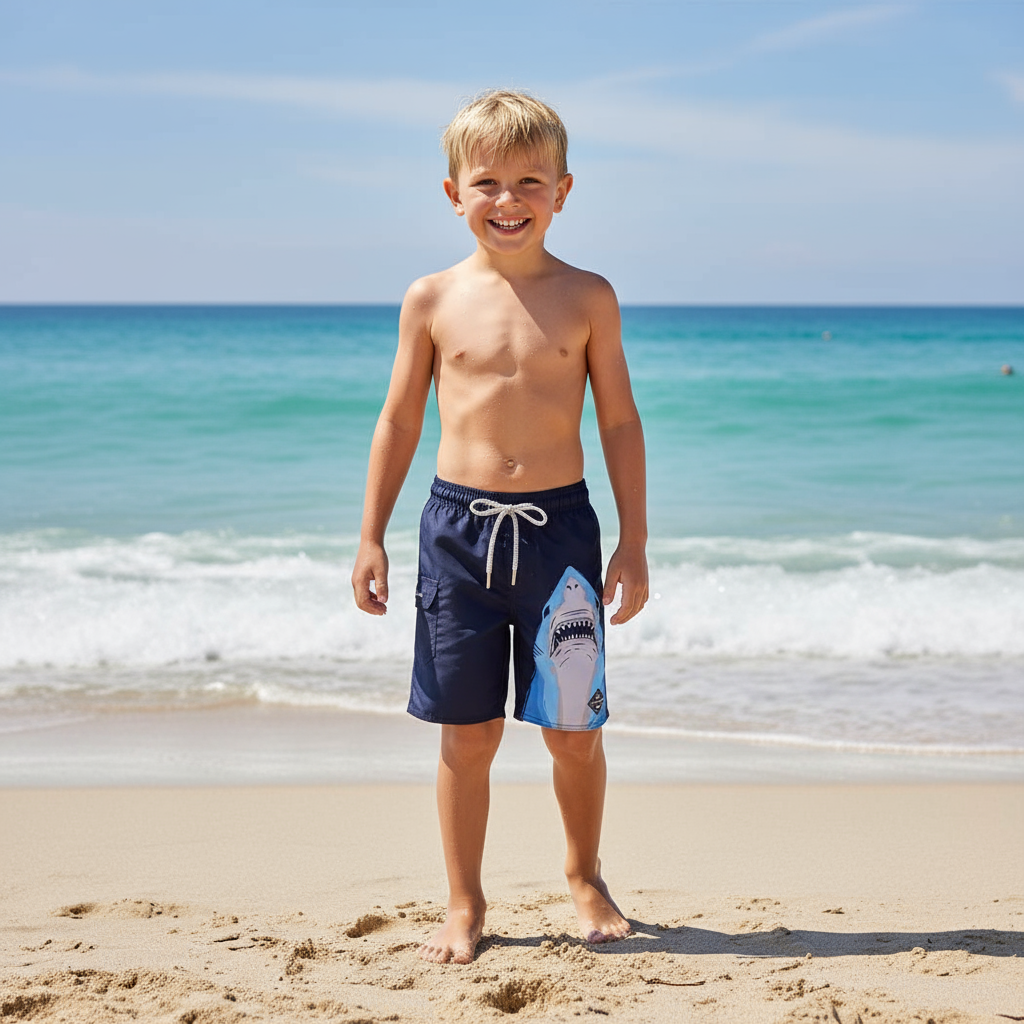 Bermuda estampada para niño con diseño de tiburón en la pierna izquierda, confeccionada en tela de secado rápido, ideal para cualquier actividad acuática. Cuenta con pretina elástica y jareta ajustable con puntas metálicas para un ajuste seguro y cómodo, calzón interno de tela calada que brinda frescura, bolsa interna oculta para objetos pequeños y una bolsa de parche en el costado con cierre de velcro y ojillo para drenaje de agua. Perfecta para la playa, la alberca o cualquier aventura acuática.