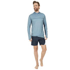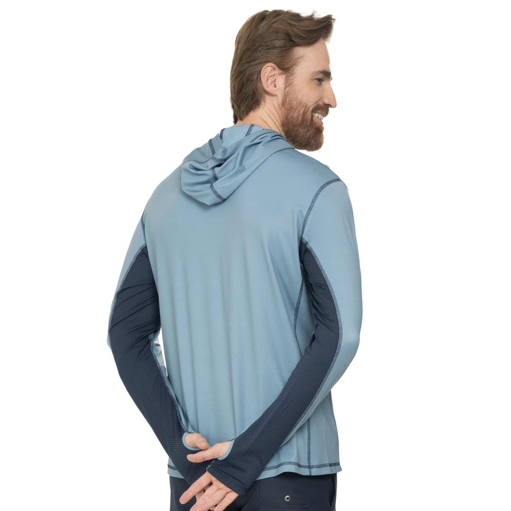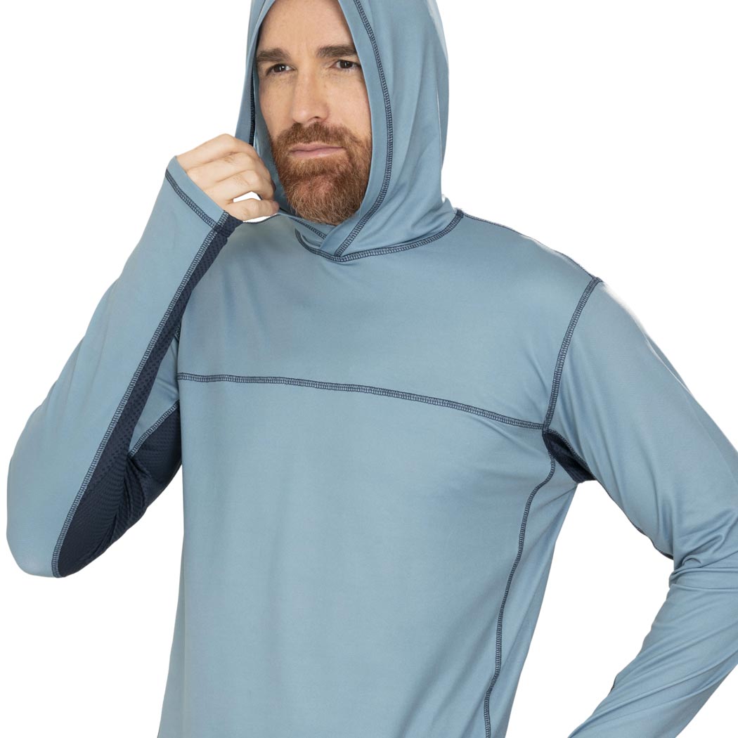 Hoodie en color cemento seco para caballero, con manga larga, capucha y perforación en manga para pulgar, de amplia cobertura, la parte inferior de las mangas cuenta con tela respirable en color marino y cuenta con nuestra recomendación UPF50+ que mantendrá tu piel protegida de los rayos solares. Mientras usas esta prenda, te mantendrás fresco y relajado, ya que esta confeccionada con tela suave y ligera, de secado ultra rápido, que no guarda olores.