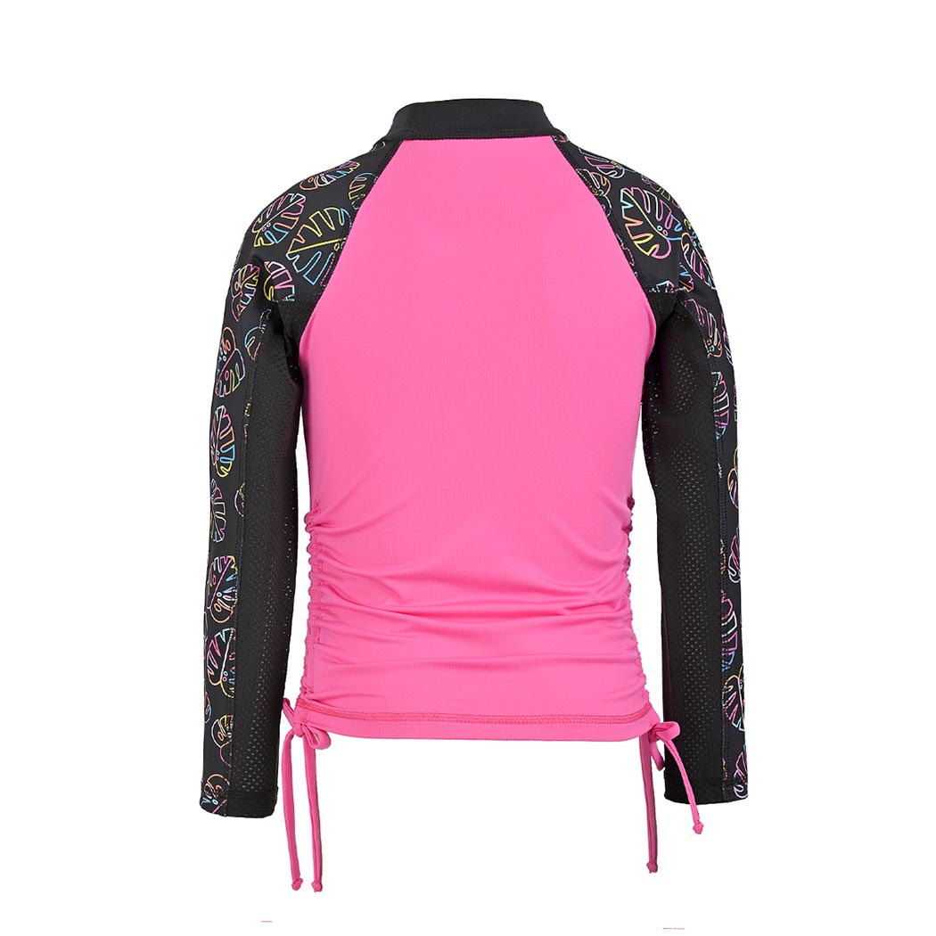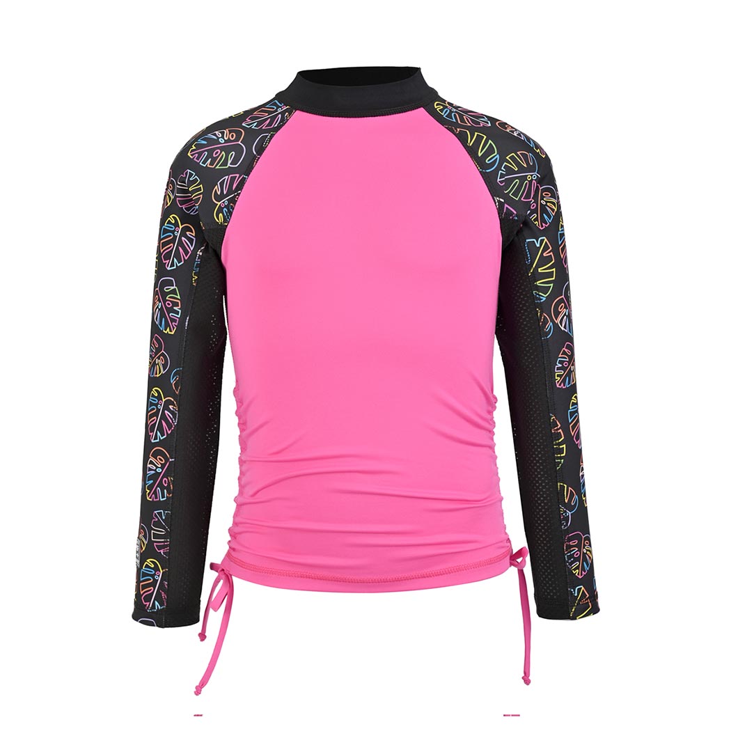 Diversión bajo el sol sin compromisos en protección. Esta playera rashguard de manga larga ofrece certificación UPF50+ para resguardar la piel delicada de las niñas en piscina, playa o parque. El diseño colorido con estampado exclusivo y logo bordado en la manga izquierda combina seguridad dermatológica con estilo. Los ajustadores laterales con jareta se adaptan al crecimiento, mientras que la tela respirable en mangas garantiza comodidad durante horas de juego acuático. La compañera perfecta para cada aventura al aire libre.