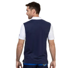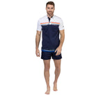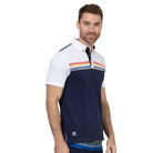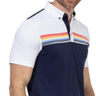 Playera Polo manga corta para caballero, en color marino, con botones en el pecho, en color blanco de las mangas, cuello y pecho, cuenta también con líneas multicolor al nivel de los botones, ideal para esos paseos a la playa o la alberca, esta playera esta confeccionada con tela fresca, suave y ligera que no guarda olores y es de secado ultra rápido, además cuenta con nuestra certificación UPF50+ que mantendrá tu piel protegida de los dañinos rayos solares.