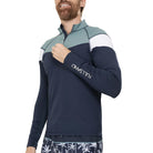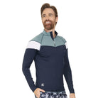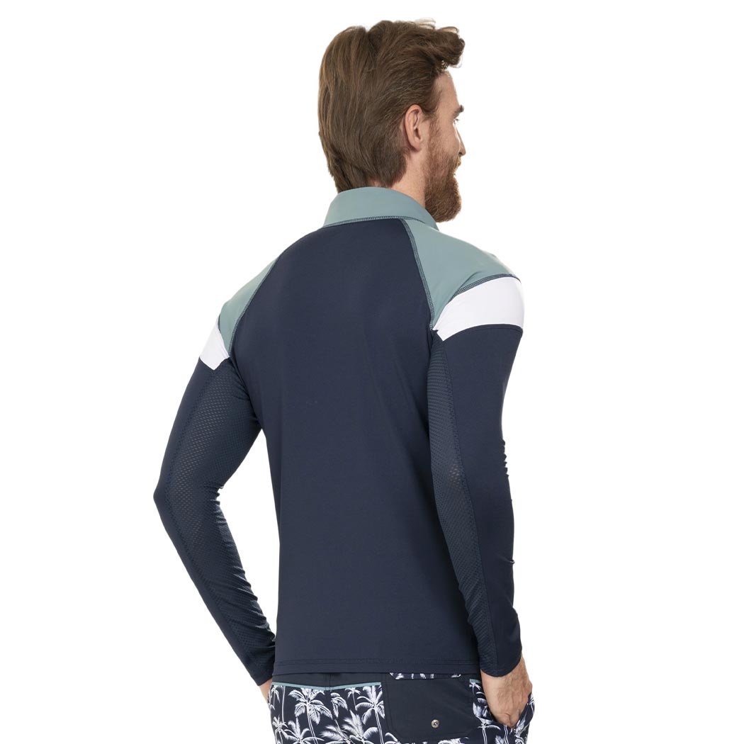 Playera Wet para caballero, color Azul Denim, con ajuste al cuerpo y cuello redondo. Cuello y pecho en color marino, mangas inferiores también. Cierre en pecho para mayor practicidad al cambio Franjas rectanculares horizontales en color blanco en brazos. Hecha en tela fresca, suave y ligera, de secado ultra Rápido que no guarda olores. Protección UPF50+ para cuidar tu piel durante actividades acuáticas y días activos bajo el sol.