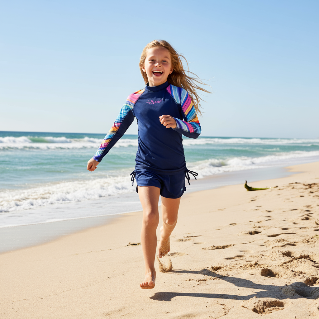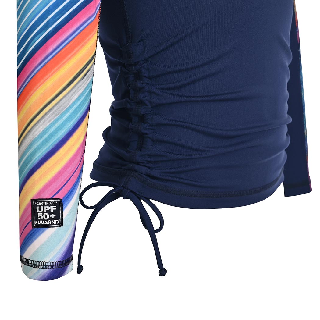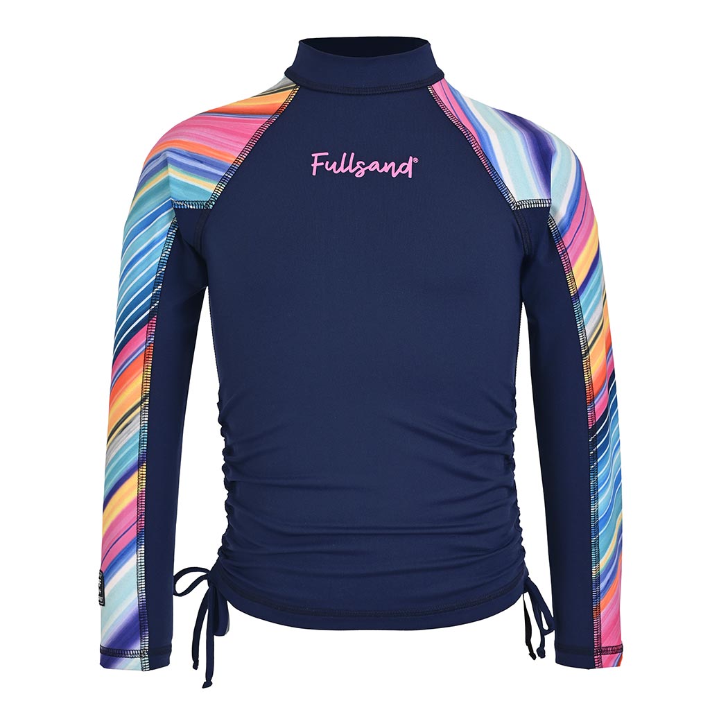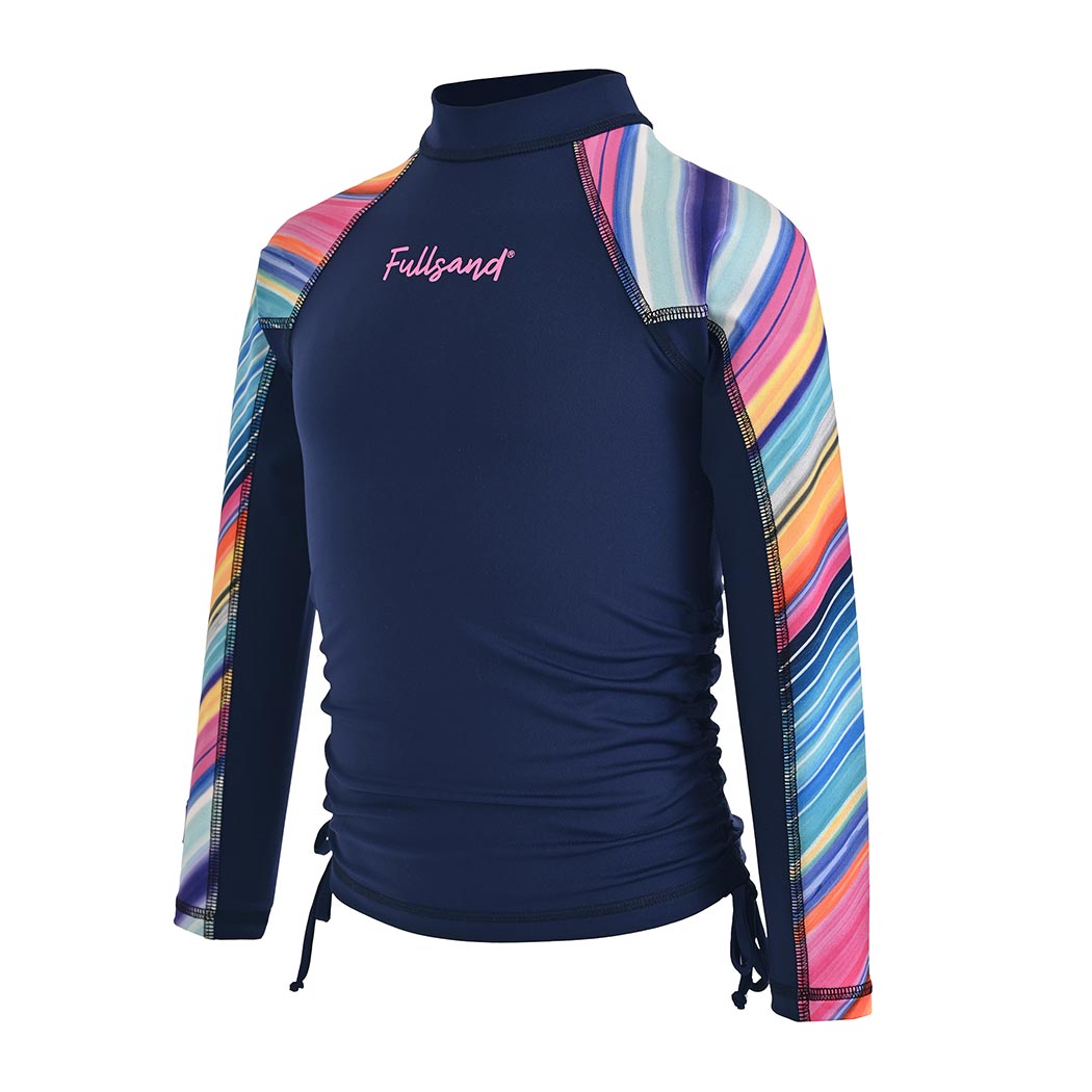 Playera tipo wet infantil de manga larga para niña, confeccionada en tela de alto desempeño con protección solar certificada UPF50+, que bloquea eficazmente más del 98% de los rayos UV. Además, está elaborada con textil de secado ultra rápido y que no guarda olores, ideal para uso prolongado en alberca, playa o parques acuáticos. El diseño destaca por su combinación de cuerpo en color marino liso con mangas largas sublimadas multicolor con el alegre motivo “Rainbow Niña”, que mezcla tonos vivos y dinámicos. Cuenta con elevadores laterales con jareta para personalizar el largo de la prenda y brindar mayor comodidad en movimiento. Incluye logotipo Fullsand® al frente en tono rosa, costuras planas visibles que previenen irritaciones, y cuello alto para una cobertura solar óptima. Una prenda funcional, segura y con mucho estilo para las pequeñas más activas.