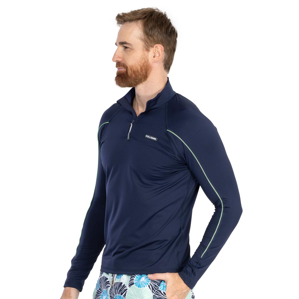 Playera Wet Shirt para caballero, ideal para actividades al aire libre y acuáticas, fabricada en tela ligera y fresca con certificación UPF50+ para máxima protección solar. Diseño de corte relajado, manga larga con cortes y vivos en contraste, cierre delantero en color marino, cuello interno en tela contrastante y etiqueta bordada con logotipo en el pecho izquierdo. Presentación lisa en tono marino, perfecta para combinar funcionalidad y estilo.