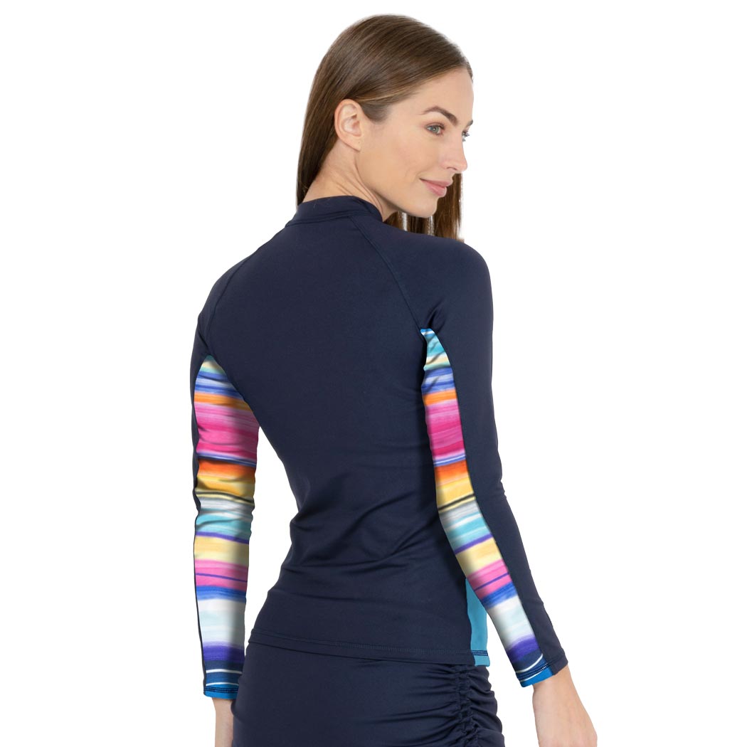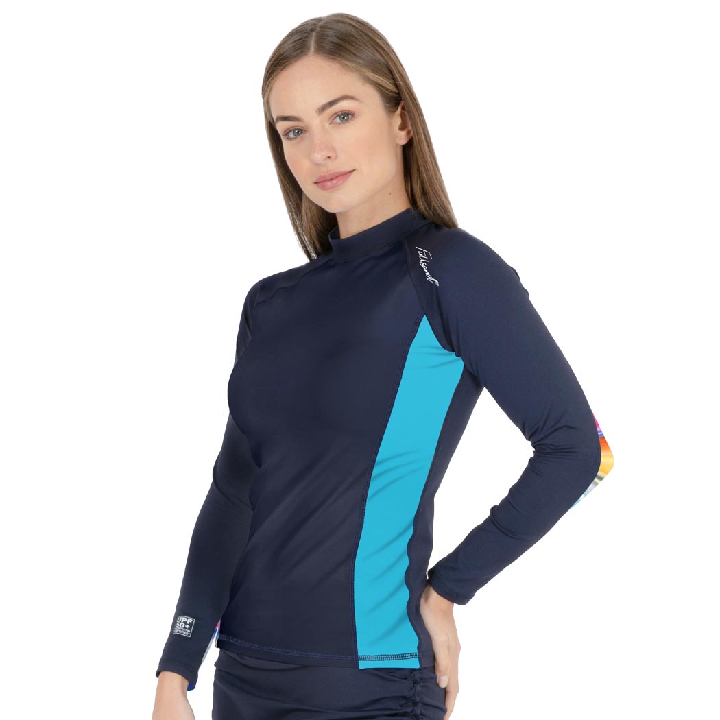 Playera Wet de manga larga para dama, diseñado para brindar protección y estilo en actividades acuáticas. El cuerpo principal está confeccionado en color liso marino, complementado con paneles laterales en azul Capri que estilizan la silueta y aportan contraste. Las mangas cuentan con tela sublimada de diseño multicolor “Rainbow”, una propuesta vibrante y dinámica que aporta un toque único a la prenda. En el hombro izquierdo, destaca la firma estampada Fullsand®, como sello de autenticidad. El tejido de alto rendimiento incorpora tecnología UPF50+, ofreciendo una barrera eficaz contra los rayos solares UVA y UVB, ideal para uso prolongado bajo el sol. Su confección en tela de secado rápido proporciona comodidad durante todo el día, ya sea dentro o fuera del agua. Una pieza pensada para mujeres activas que buscan protección solar sin renunciar al diseño.