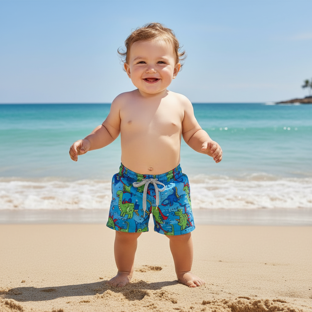 Short de baño para bebé confeccionado en tela sublimada con divertido estampado “Din” de dinosaurios en tonos vibrantes. Ideal para los días de playa o alberca, este short combina funcionalidad y diseño pensado especialmente para los más pequeños. Cuenta con una calzona interna de tela calada que brinda mayor soporte y comodidad, permitiendo libertad de movimiento sin irritaciones. Su cintura elástica con jareta ajustable asegura un ajuste perfecto y seguro para mantener la prenda en su lugar durante toda la actividad. Fabricado con tela de secado rápido y tecnología UPF50+, que ofrece protección solar efectiva bloqueando más del 98% de los rayos UVA y UVB, cuidando la piel delicada del bebé mientras se divierte. Una prenda esencial para disfrutar del agua con estilo, seguridad y libertad.
