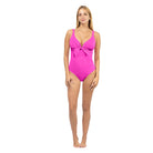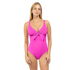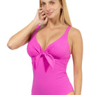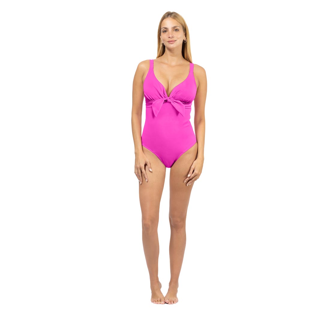 Luce elegante y segura con este traje de baño completo en vibrante color fucsia, con escote en “V” y detalle cruzado al frente con un delicado moño decorativo. Cuenta con copas removibles, tirantes ajustables y espalda recta para un ajuste cómodo, además de control abdominal que estiliza tu figura. Confeccionado en fibra de nylon plus resistente, brinda protección UV (UPF50) y alta durabilidad ante el cloro, perfecto para disfrutar el sol con estilo.
