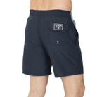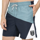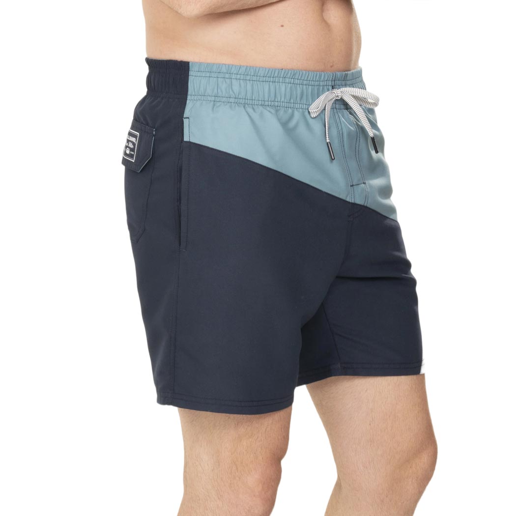 Bermuda de baño para hombre en color marino, confeccionada en tejido liso de secado rápido con pretina elástica y jareta ajustable con puntas metálicas; incluye cortes diagonales en colores de contraste, calzón interno de tela calada para mayor soporte, bolsas laterales, bolsa trasera con velcro y ojillo para drenar el agua, bolsa interna oculta y un práctico detalle de cinta en la pretina interna trasera para colgar la prenda; una opción cómoda, funcional y moderna para playa o alberca.