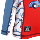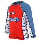Listo para la aventura acuática, este wet suit de manga larga protege la piel de tu bebé con tela UPF 50+ y secado rápido, ideal para días de sol y diversión. Su diseño combina un frente rojo vibrante con mangas y cuello azul denim, y un tierno estampado de carrito de carreras con banderines en el pecho. Los laterales y mangas inferiores, en tela sublimada con motivo de coches, le dan un toque lleno de energía y movimiento. Incluye práctico botón de presión en la parte trasera del cuello para facilitar el cambio. Comodidad, estilo y protección para los pequeños pilotos del agua.