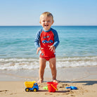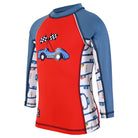 Diseñado para acompañar cada chapuzón con estilo y protección, este wet suit de manga larga es perfecto para los pequeños amantes de la velocidad. Con frente rojo y detalles en azul denim, destaca por su divertido estampado de carrito de carreras con banderines en el pecho. Las mangas inferiores y laterales, en tela sublimada con motivo de coches, añaden un toque lleno de energía y color. Su tela de secado rápido con protección solar UPF 50+ mantiene la piel protegida y fresca, mientras que su tecnología evita los olores. Ideal para días de alberca, playa o cualquier aventura acuática bajo el sol