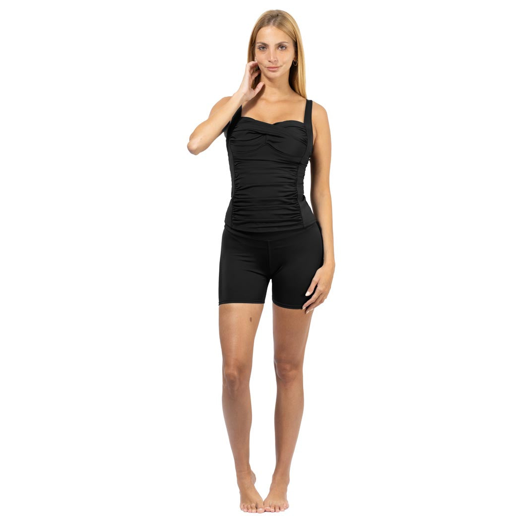 Moldea tu silueta con seguridad y confort usando nuestro traje de baño tipo short para mujer en color negro, diseñado con retina alta para estilizar la figura, control abdominal y cobertura total hasta la mitad del muslo; confeccionado en resistente fibra de nylon plus, cuenta con tecnología de secado rápido y protección UV UPF50, ideal para disfrutar de tus actividades acuáticas con libertad, soporte y estilo.
