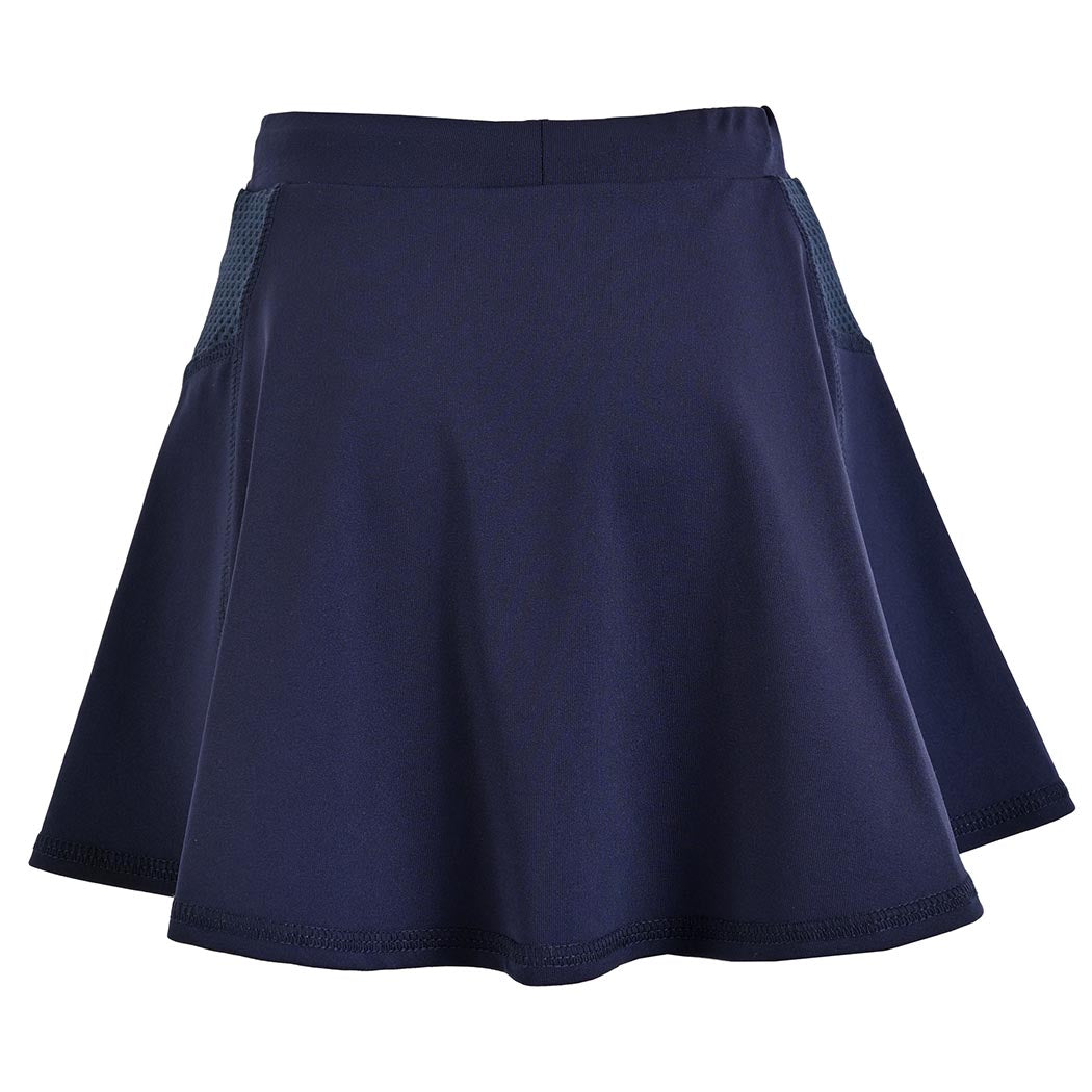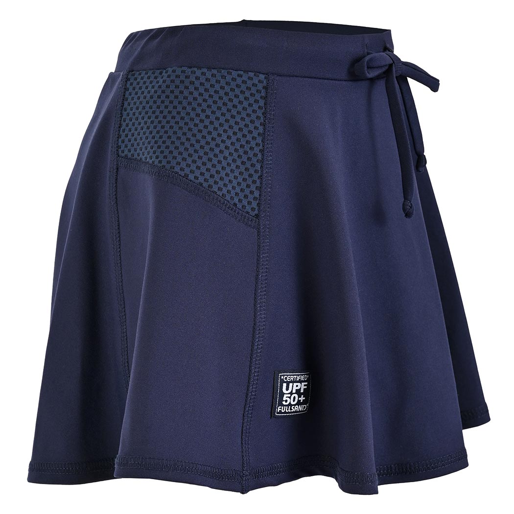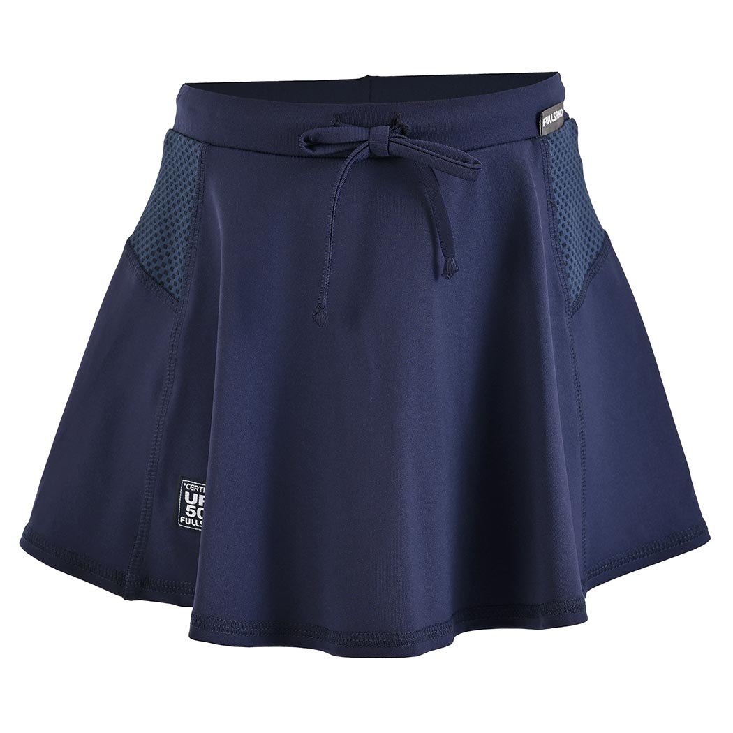 Falda tipo skort para niña, diseñada para brindar comodidad, protección y libertad de movimiento en actividades al aire libre y deportivas. Elaborada en textil funcional con tecnología de secado ultra rápido y certificación UPF50+, que protege la piel de los rayos UV bloqueando más del 98% de la radiación solar. El diseño en color marino liso incorpora short interno integrado para mayor seguridad y cobertura. Destaca por sus paneles laterales en mesh respirable del mismo tono, que favorecen la ventilación y frescura durante el uso. Cuenta con pretina ancha ajustable mediante jareta frontal, brindando un ajuste firme y cómodo. Etiqueta tejida decorativa con la certificación UPF50+ visible en el costado y logotipo en cintura. Ideal para actividades acuáticas, deportivas o como complemento casual para el verano.
