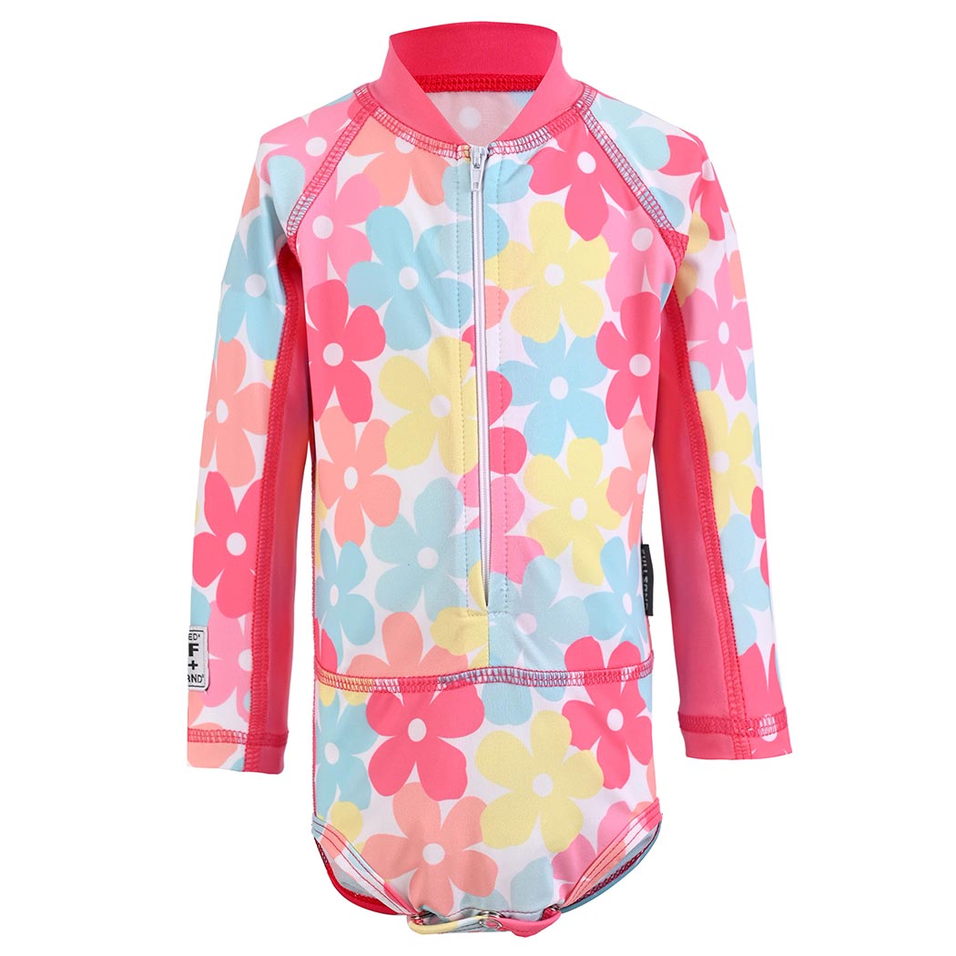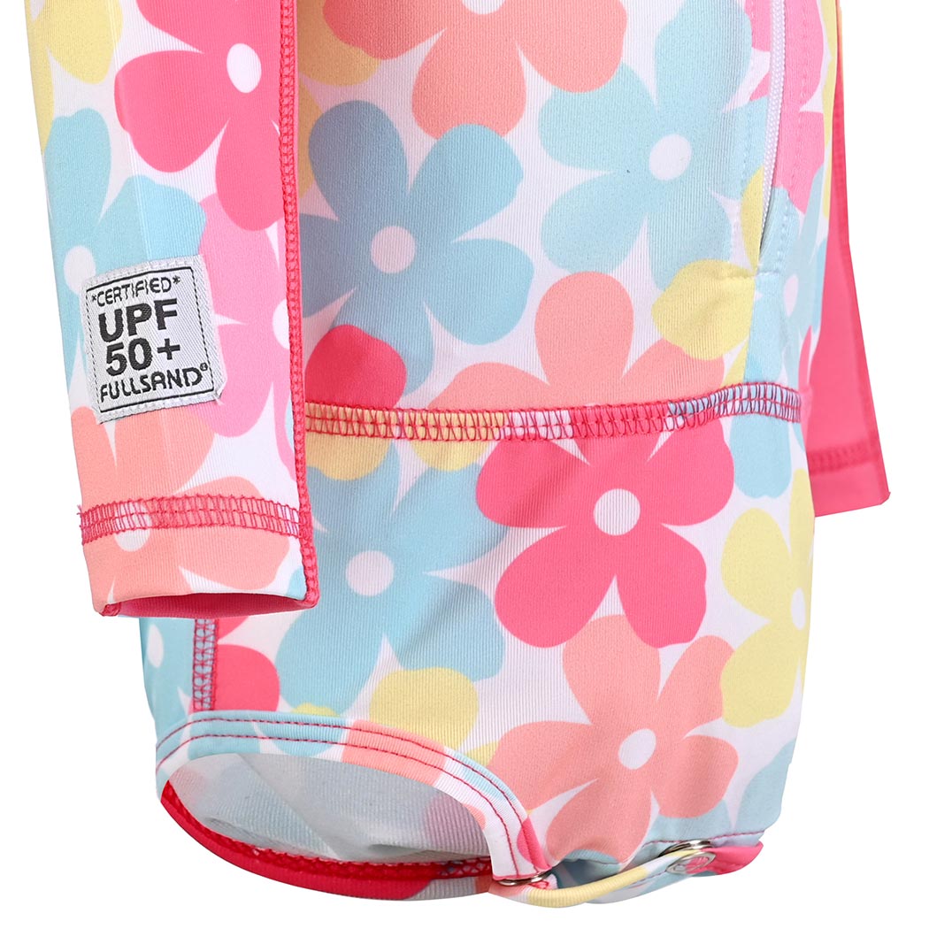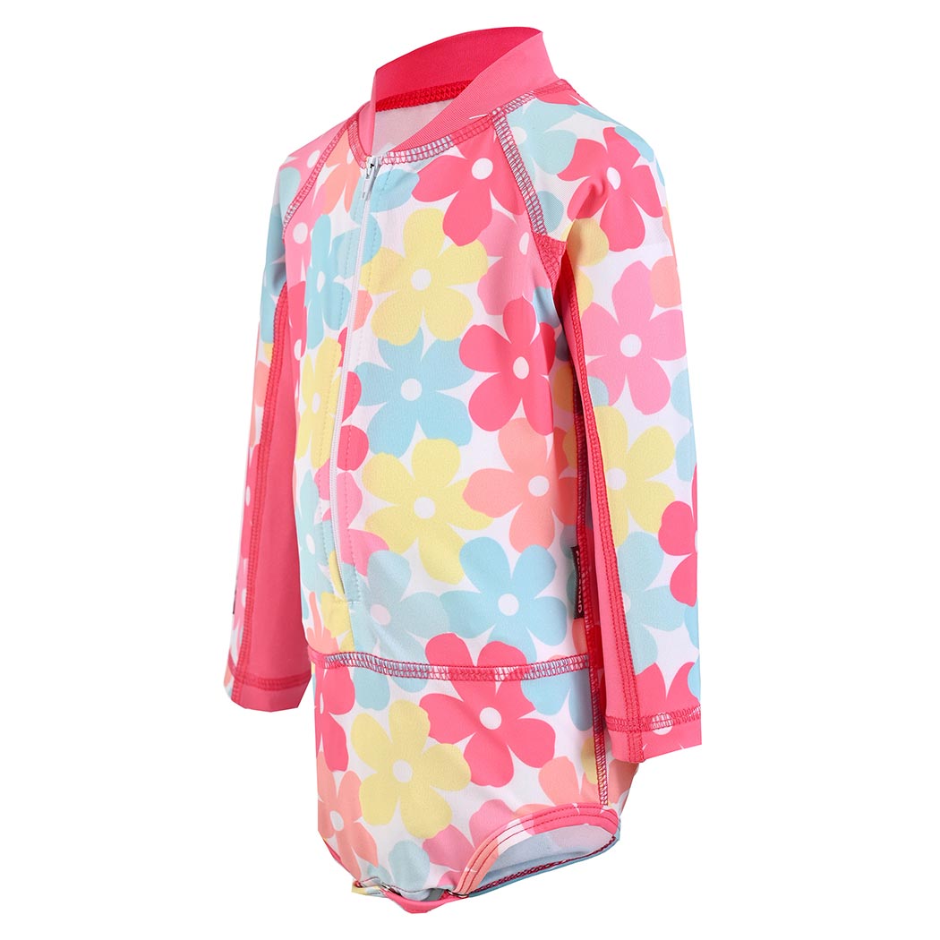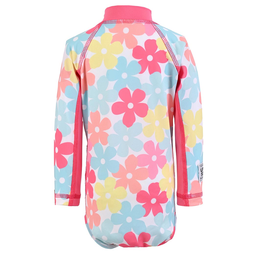 Para que tu hija luzca super coqueta y disfrute en grande las vacaiones en la playa o la alberca bajo el sol, te presentamos esta Wetswim, multicolor en tela sublimada motivo campestre, con cuello y mangas inferiores en color salmón, esta prenda cuenta con cierre frontal y botones en la entrepierna, para un cambio mas eficiente del pañal, esta confeccionado de tela fresca, suave y ligera, de secado ultra rápido, que cuen ta con nuestra certificación UPF50+ para cuidar la piel de tu hija de los rayos dañinos UV.