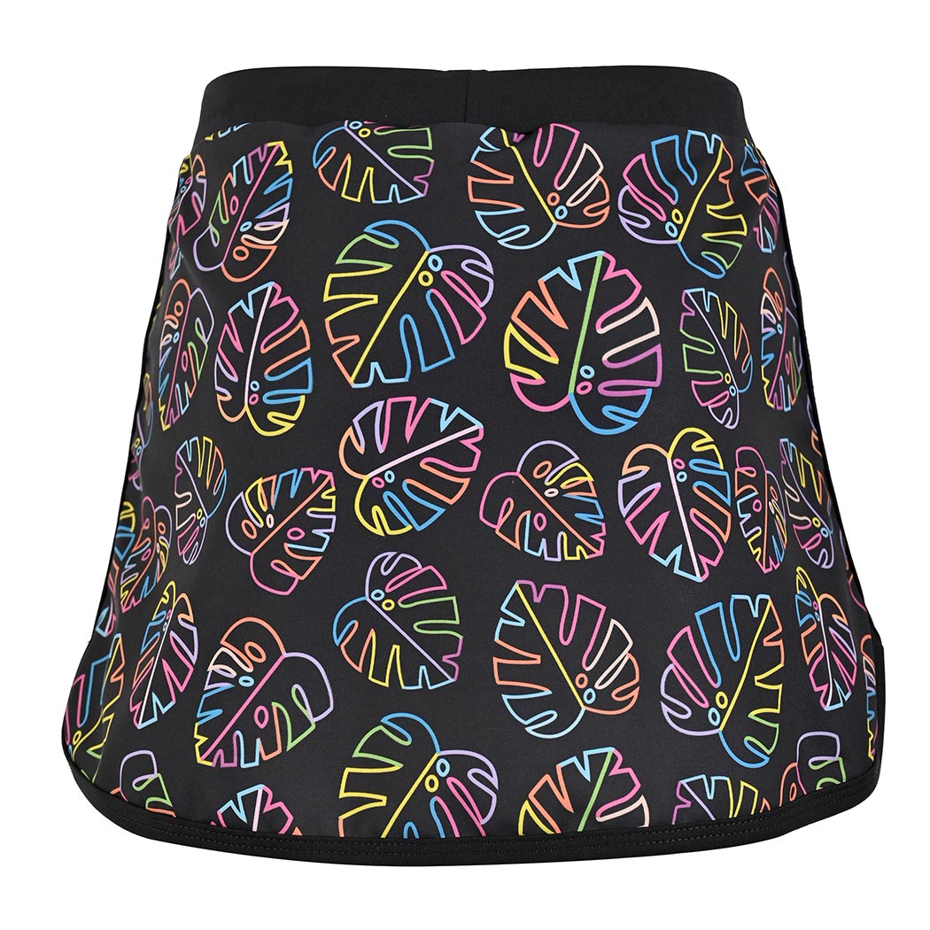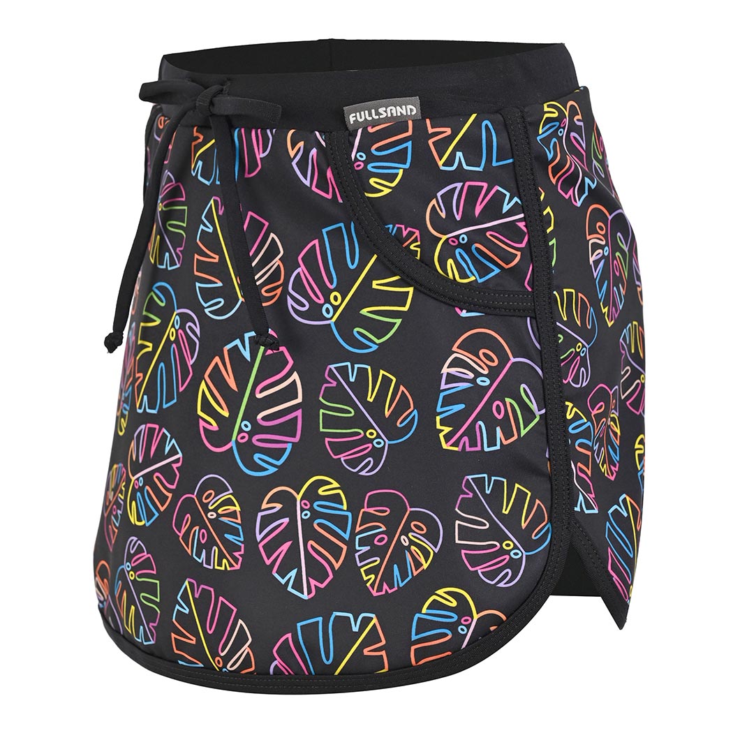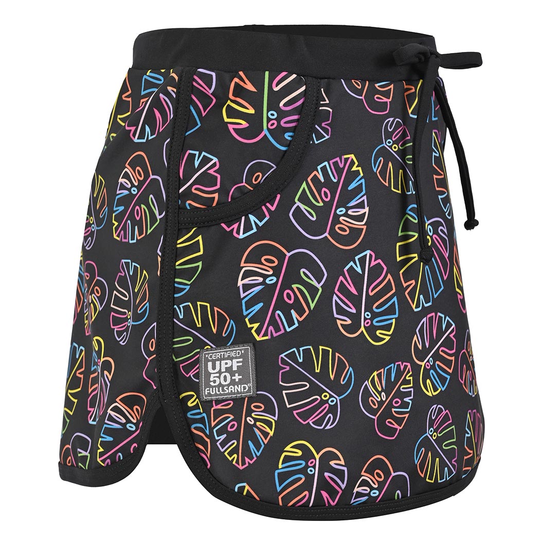 Esta falda skort para niña en color negro es la aliada perfecta para disfrutar el sol sin preocupaciones, gracias a su certificación UPF50+ que ayuda a proteger su piel de los rayos solares mientras juega y se mueve libremente; su secado rápido, el corte en línea A con elástico en la pretina y el short interno de lycra lisa ofrecen comodidad total todo el día, mientras el estampado Colori, el encintado en contraste en el ruedo y la simulación de bolsa le suman un look divertido y moderno, ideal para la playa y las aventuras bajo el sol