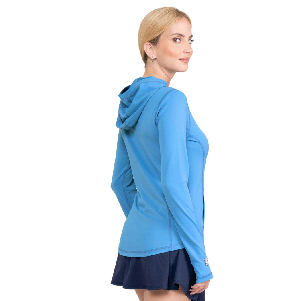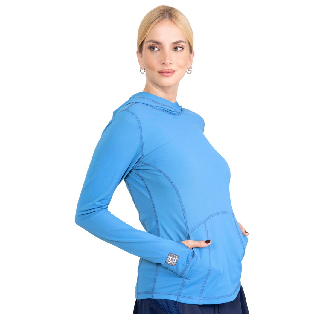 ¡Luce cómoda y protegida! Playera hoodie con capucha y manga larga en color perry certificada UPF50+ para todas tus actividades en playa, piscina y aire libre. Corte perfecto al cuerpo con secado rápido, aberturas de dedo en mangas que te dejan libre para moverte, etiqueta TAB bordada con logo en costado y bolsa delantera funcional. Tela respirable en costados garantiza ventilación. ¡Protección solar con estilo casual!