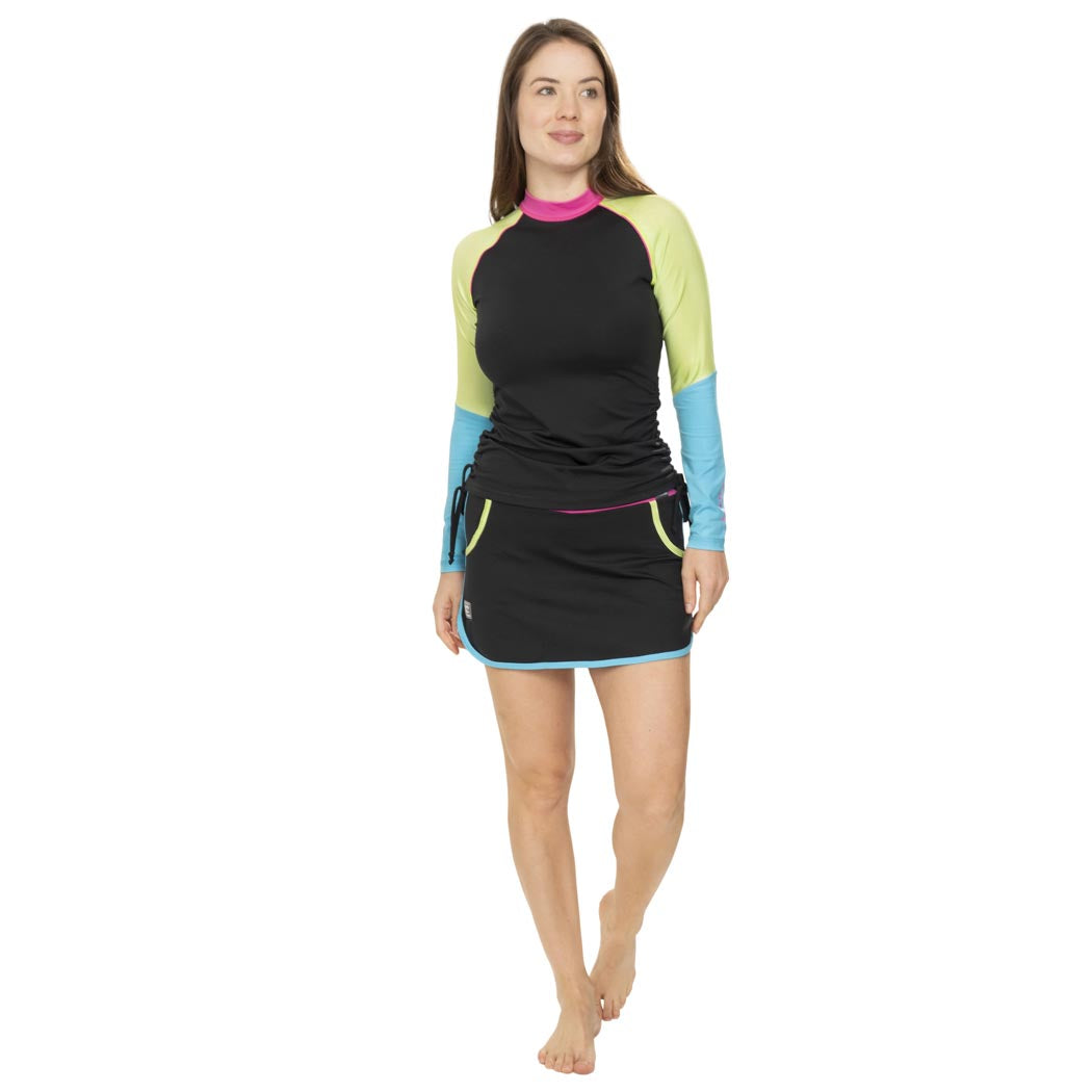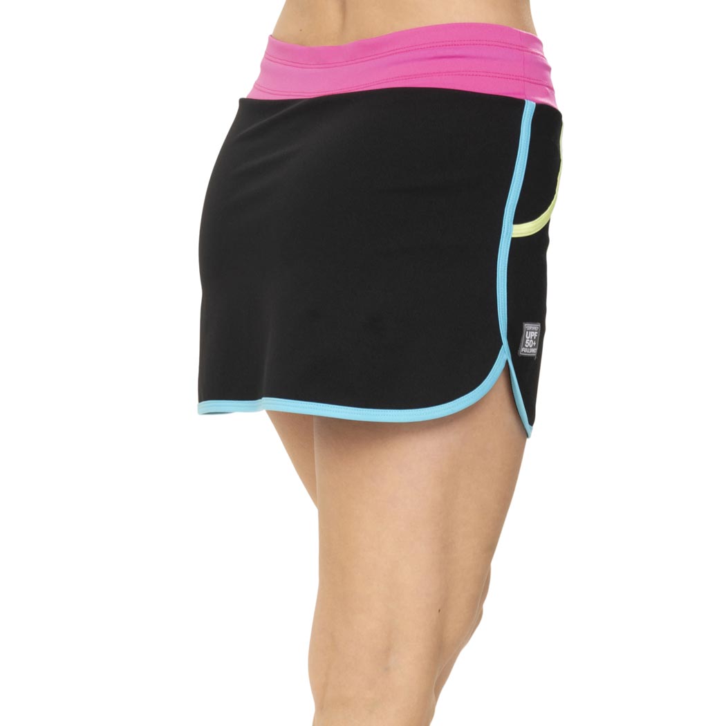 Combina estilo y protección en esta falda skort diseñada para movimiento y diversión. Con certificación UPF50+ y secado rápido, es tu aliada perfecta para días de playa o piscina. El corte en línea A favorece cualquier figura, mientras que el short interior de lycra lisa garantiza comodidad y seguridad en cada movimiento. Detalles premium como la etiqueta TAB bordada en la pretina, encintado en ruedo y simulador de bolsa en colores contraste le dan ese toque sofisticado. La jareta interna ajustable asegura un calce perfecto. Negra, versátil y lista para cada aventura acuática.