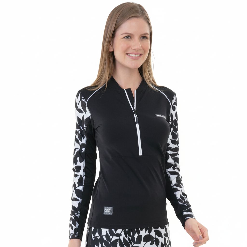 Lista para el sol, el mar y toda la acción, la Playera Rashguard con Cierre para Mujer FULLSAND con Protección Solar Certificada UPF 50+ es tu mejor aliada para verte increíble mientras te proteges. Su tecnología de secado rápido y tela ligera y fresca te mantienen cómoda dentro y fuera del agua, mientras su ajuste al cuerpo resalta tu silueta sin perder libertad de movimiento (y sí, ¡no guarda olores!). Su diseño moderno combina manga larga, cierre en pecho en color negro, estampado Noir en mangas y cortes en hombros con vivos en contraste que le dan un toque sporty y cool. Perfecta para surfear, nadar o simplemente disfrutar bajo el sol con estilo, comodidad y actitud.