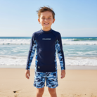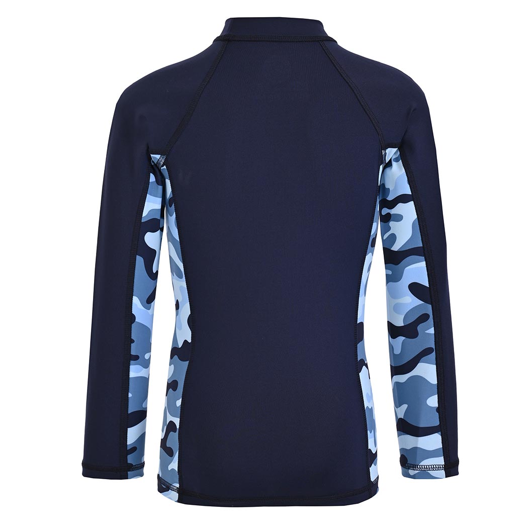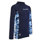 Que el outfit de tu pequeño no sea limitante para que disfruten en grande de las vacaciones en la playa o la alberca, te recomendamos esta wet de manga larga y cuello redondo en color marino, con laterales en cuerpo y mangas inferiores con tela sublimada motivo camuflaje en tonos azules, con nuestra firma estampada en pecho, esta prenda esta confeccionada con tela fresca, suave y ligera que no guarda olores y es de secado ultra rápido, que cuenta con nuestra certificación UPF50+ que mantendrá la piel de tu pequeño protegida de los rayos solares.