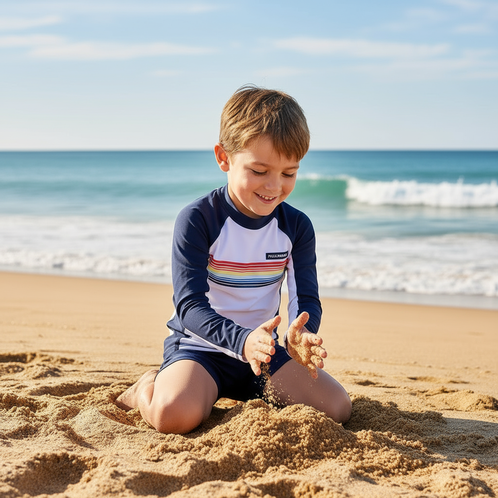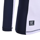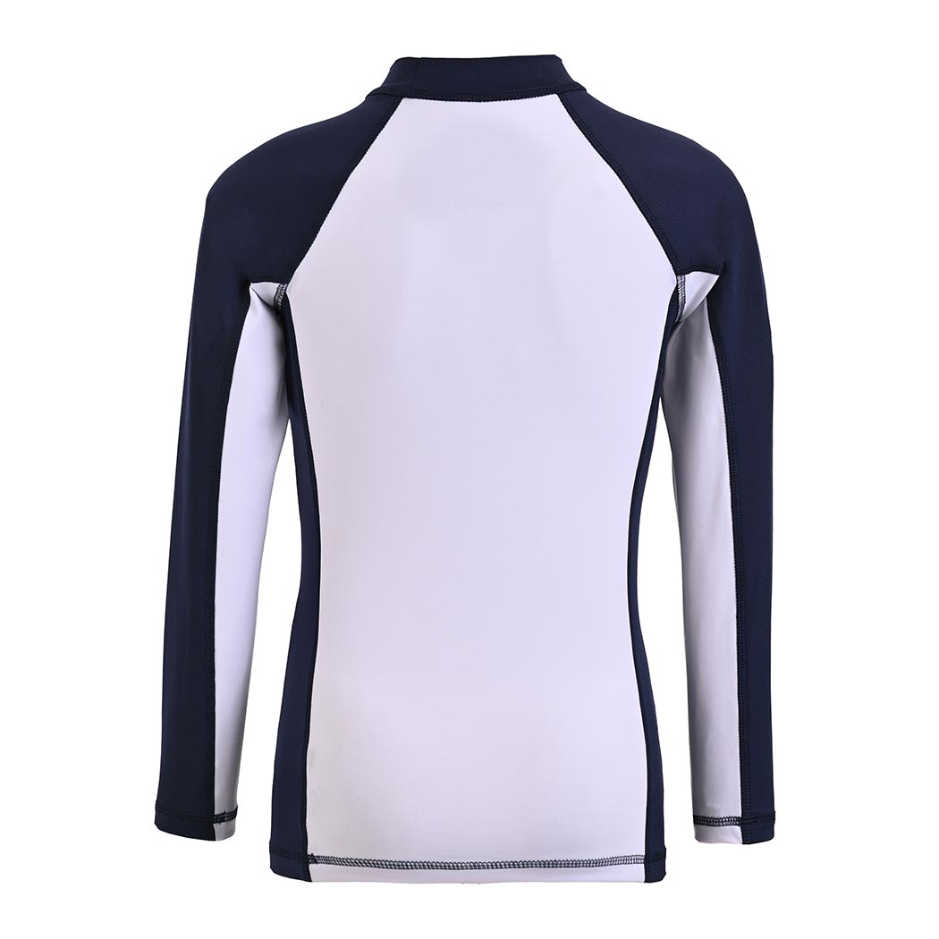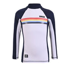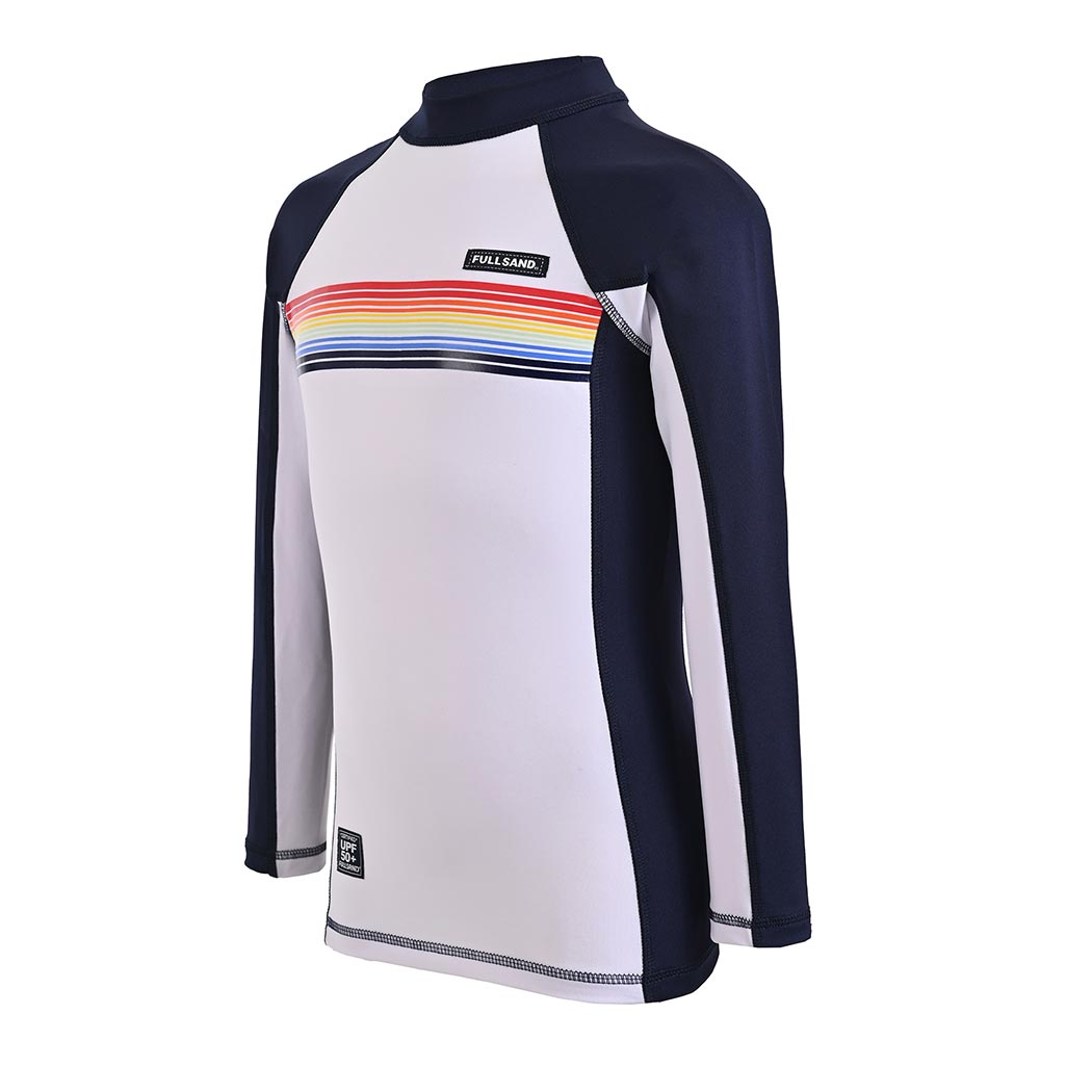 Para esas escapadas a la playa o las vacaciones y alberca, te presentamos esta Wet para niño, de manga larga en color blanco, con cuello, mangas superiores y laterales en color marino, con franjas multicolor horizontales en el pecho, bajo nuestra firma en etiqueta tab bordada, esta prenda es ideal para proteger la piel de tu pequeño de los rayos solares ya que cuenta con nuestra certificación UPF50+, confeccionada de tela fresca, suave y ligera que es de secado ultra rápido sin guardar olores, super recomendada para actividades acuáticas.