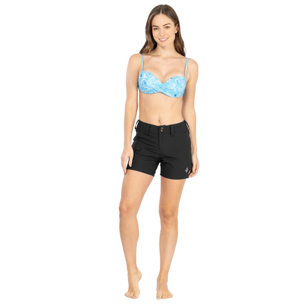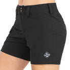 Te presentamos este short para dama, de nuestra línea Outdoor, en color negro liso con botón en pretina, puedes realizar tus actividades al aire libre, tiene pretina fija con botones y trabas, cuenta con bragueta con cierre, de tela suave, ligera y elástica, tiene bolsas traseras, cuenta con nuestra firma en etiqueta en forma de rombo en pierna izquierda, bolsa simulada o de parche en costado y cuenta con nuestra recomendación UPF50+ que protege tu piel de los rayos UV.