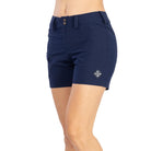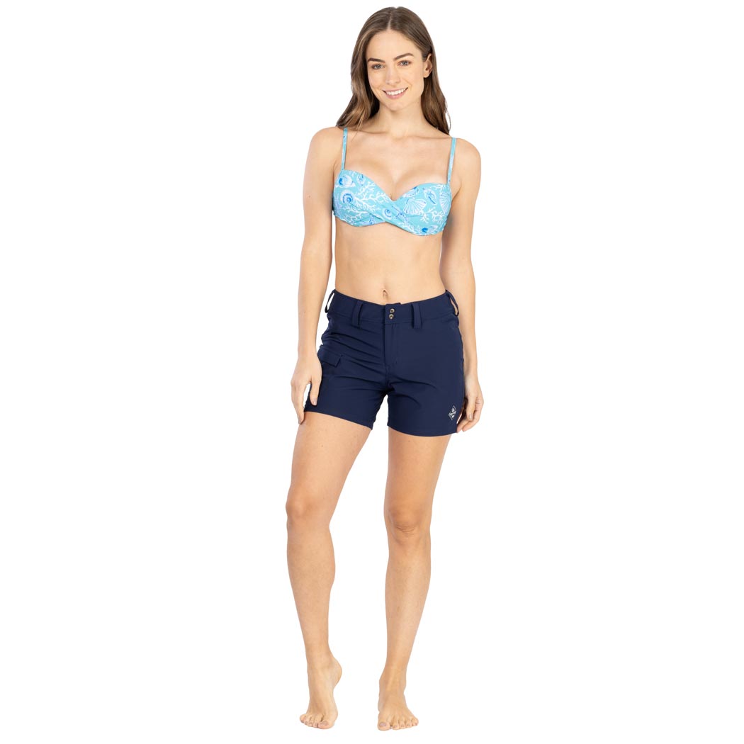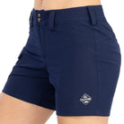 Te presentamos este short para dama, de nuestra línea Outdoor, en color azul marino liso con botón en pretina, puedes realizar tus actividades al aire libre, tiene pretina fija con botones y trabas, cuenta con bragueta con cierre, de tela suave, ligera y elástica, tiene bolsas traseras, cuenta con nuestra firma en etiqueta en forma de rombo en pierna izquierda, bolsa simulada o de parche en costado y cuenta con nuestra recomendación UPF50+ que protege tu piel de los rayos UV.