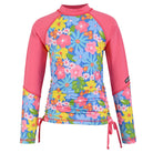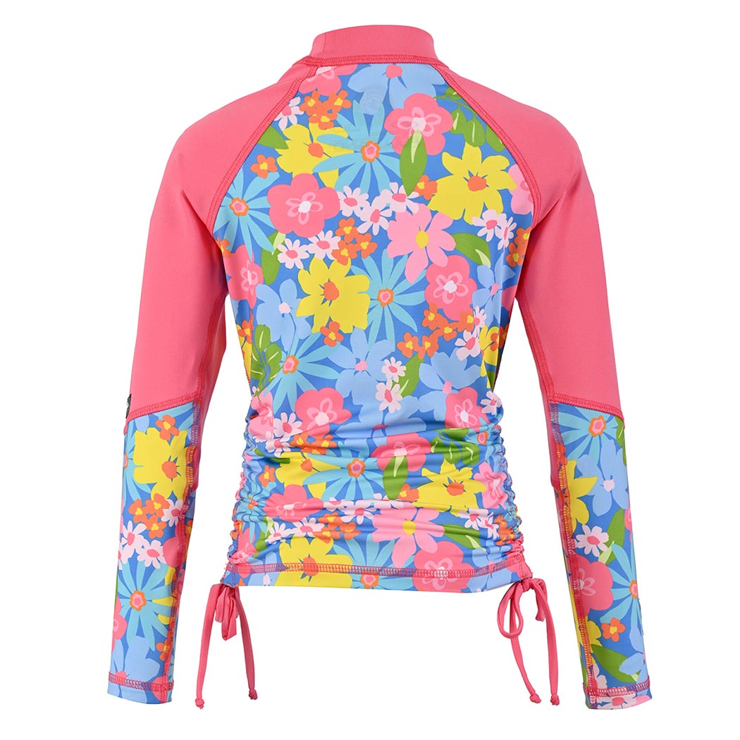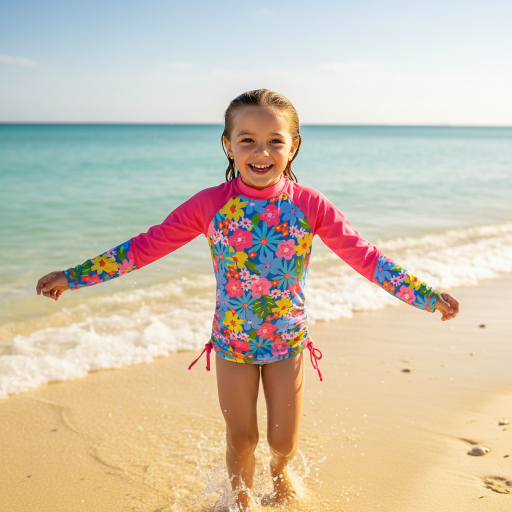 Mantén a tu niña protegida y cómoda con esta playera rashguard diseñada para aventuras acuáticas. Con certificación UPF50+, secado rápido y ajustadores laterales, ofrece protección solar confiable sin sacrificar el estilo. El estampado Jardín Celeste en tonos frescos, cortes diagonales en contraste y logo bordado crean un look que combina diversión y funcionalidad. Perfecta para piscina, playa o cualquier actividad bajo el sol.