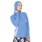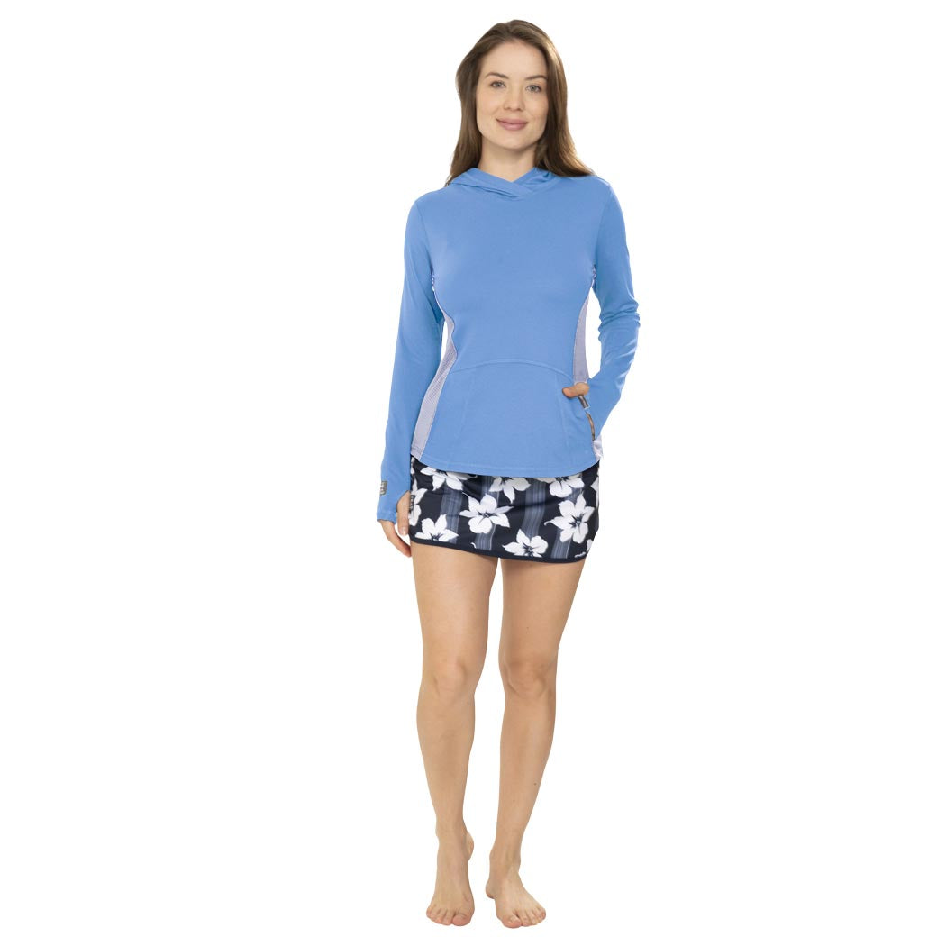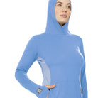Diseñada para brindar protección solar y confort, esta playera hoodie con capucha para dama es ideal para cualquier actividad al aire libre o acuática. Con certificación UPF50+, protege eficazmente contra los rayos UV, mientras su corte ajustado y tela ligera garantizan libertad de movimiento. Incorpora capucha, mangas largas con abertura para dedo y paneles laterales en tela respirable que mejoran la ventilación. Su diseño liso incluye una práctica bolsa delantera y etiqueta TAB bordada con logo en el costado. Disponible en elegantes variantes de color azul claro, combina funcionalidad y estilo en una sola prenda.