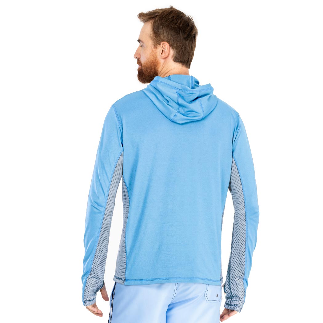 Hoodie en color azul peri para caballero, con manga larga, capucha y perforación en manga para pulgar, de amplia cobertura, la parte inferior de las mangas cuenta con tela respirable en color marino y cuenta con nuestra recomendación UPF50+ que mantendrá tu piel protegida de los rayos solares. Mientras usas esta prenda, te mantendrás fresco y relajado, ya que esta confeccionada con tela suave y ligera, de secado ultra rápido, que no guarda olores.