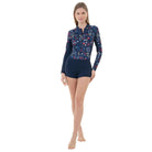 Protección solar y estilo se encuentran en este traje de baño manga larga para mujer con certificación UPF50+. Diseñado para mantener tu piel segura mientras disfrutas del sol, el agua y la aventura. La tela ligera y fresca se seca rápidamente, ajustándose perfectamente a tu cuerpo para máxima comodidad en cualquier actividad al aire libre o acuática. El hermoso estampado Ola Botánica decora el delantero y las mangas, mientras que los cortes estratégicos en costados y mangas añaden movimiento y flexibilidad. Cierre frontal en color Marino y short cachetero simulado completan este diseño versátil. Con la etiqueta TAB bordada con logo en costado como sello de calidad. ¡Protegida, cómoda y lista para brillar!