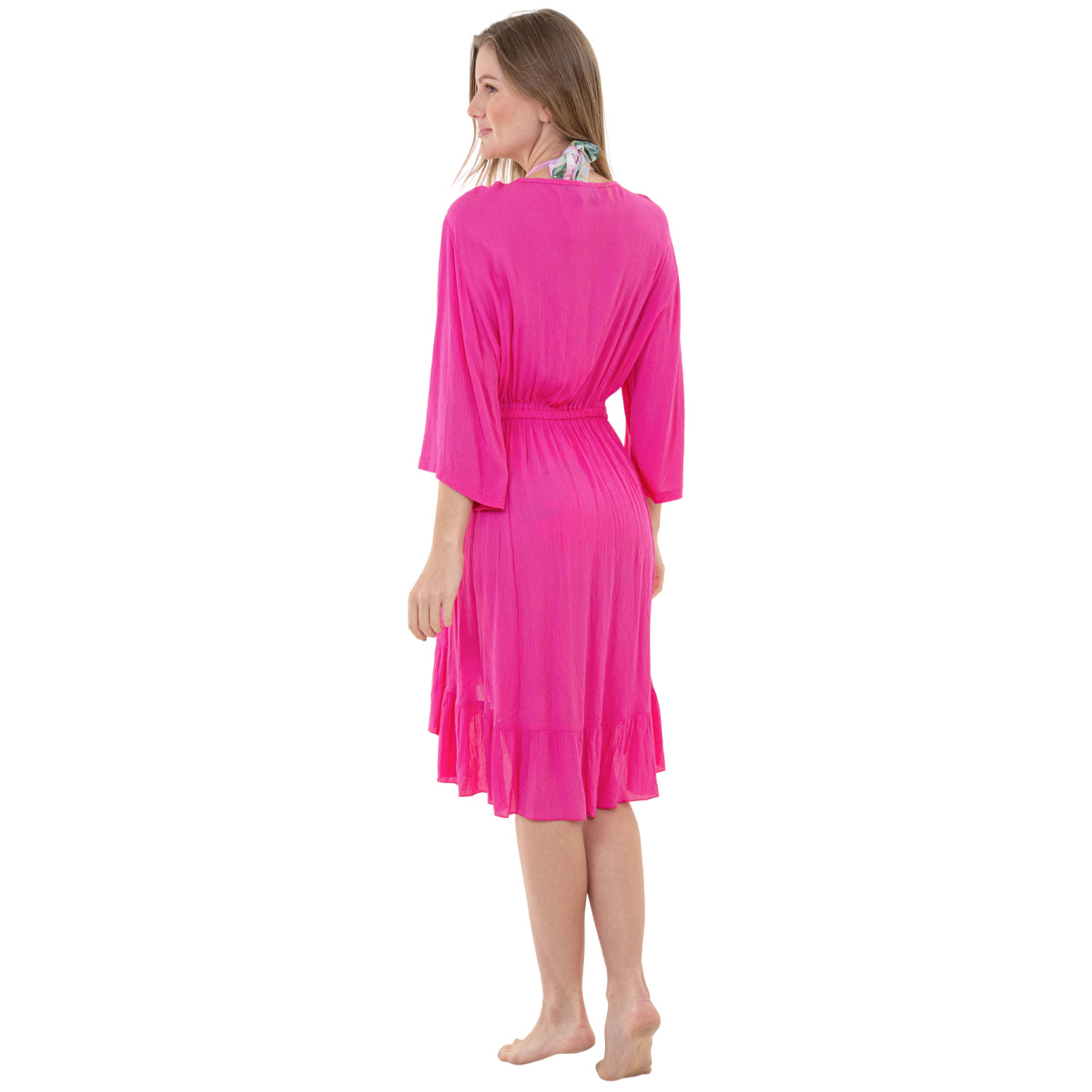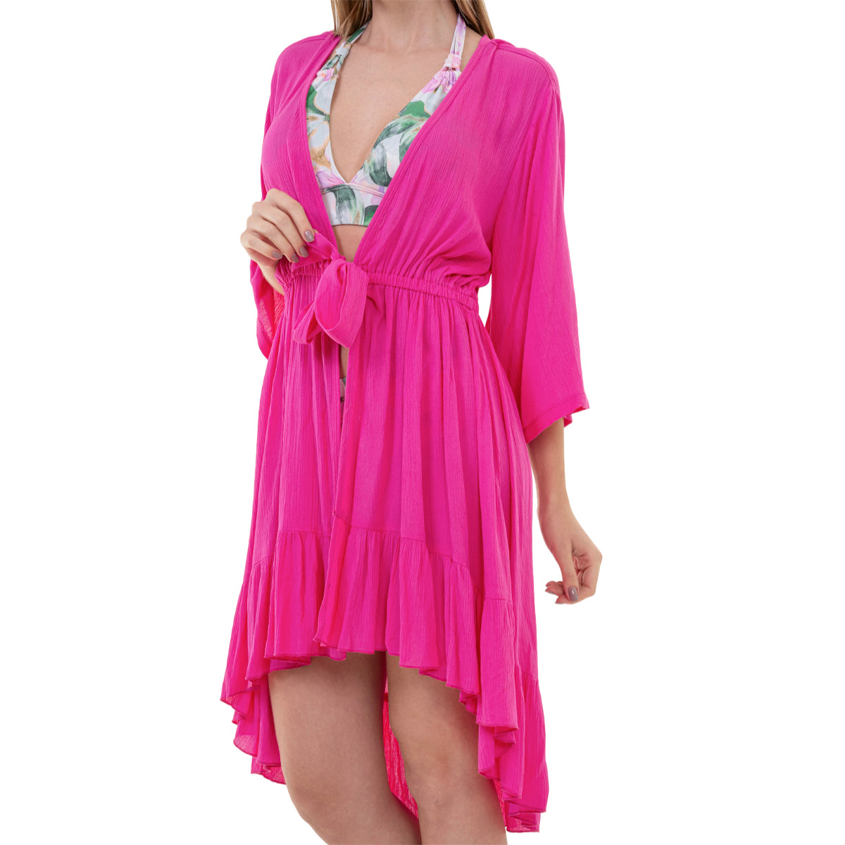 Disfruta del sol con estilo y frescura en esta salida de playa en color rosa para mujer. Su tela de viscosa ligera te envuelve en comodidad, mientras el frente abierto con cinta de amarre añade un toque coqueto y personalizable. Las mangas acampanadas le dan un aire divertido y suelto, perfecto para esos días de descanso junto al mar. ¡Prepárate para lucir radiante y sentir la brisa con cada movimiento!