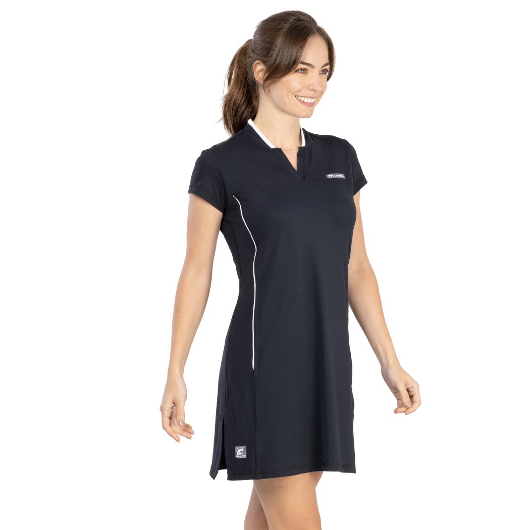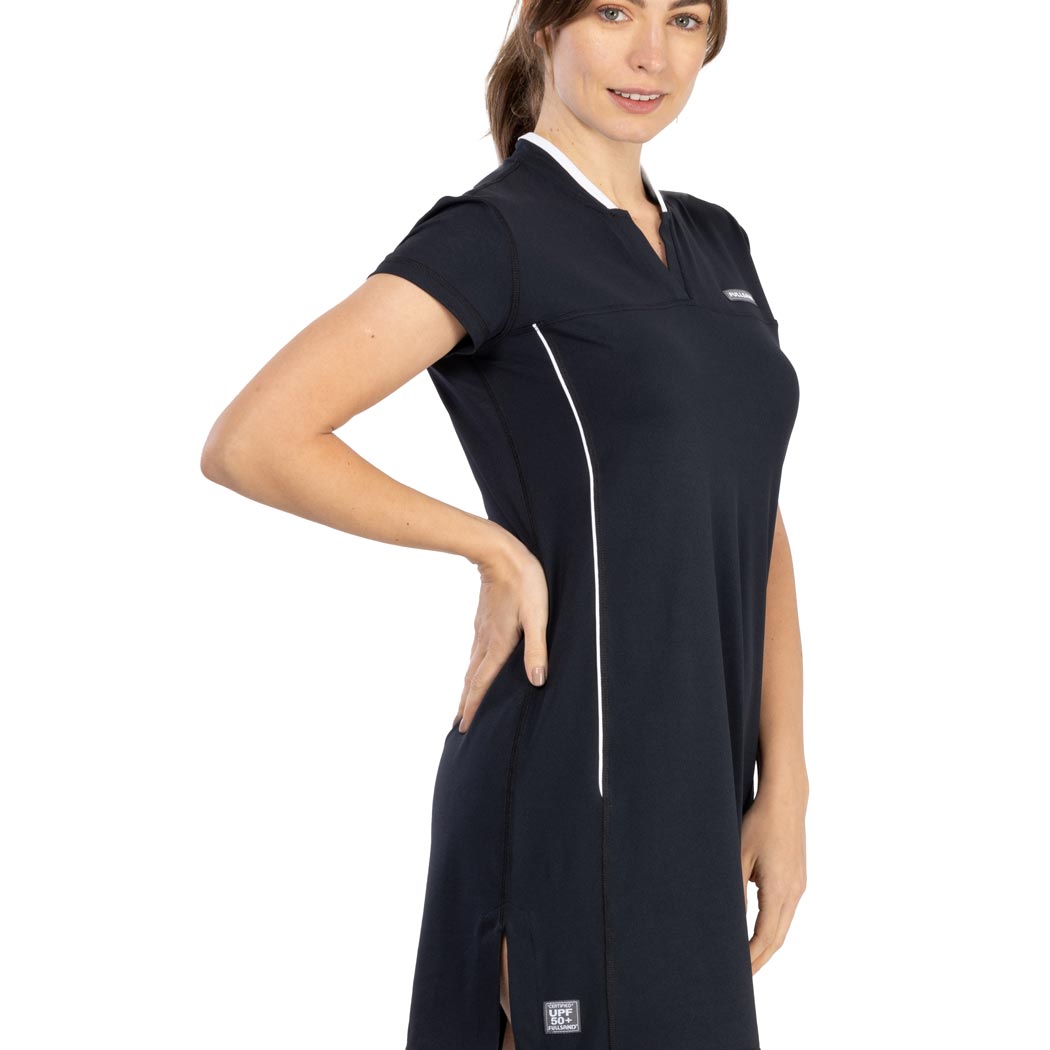 Este vestido liso de manga corta combina elegancia y funcionalidad con su diseño en línea "A" y corte ajustado que realza la silueta. Fabricado con materiales de alta calidad y certificación UPF 50+, ofrece máxima protección solar sin sacrificar el estilo. Disponible en color negro, incluye detalles sofisticados como vivos delanteros y encintado en cuello en tonos contrastantes, además de un logo bordado en el pecho izquierdo que añade un toque de exclusividad. Perfecto para ocasiones casuales o eventos al aire libre, este vestido es la elección ideal para mujeres que buscan comodidad, protección y un look impecable. ¡Luce radiante y segura bajo el sol!