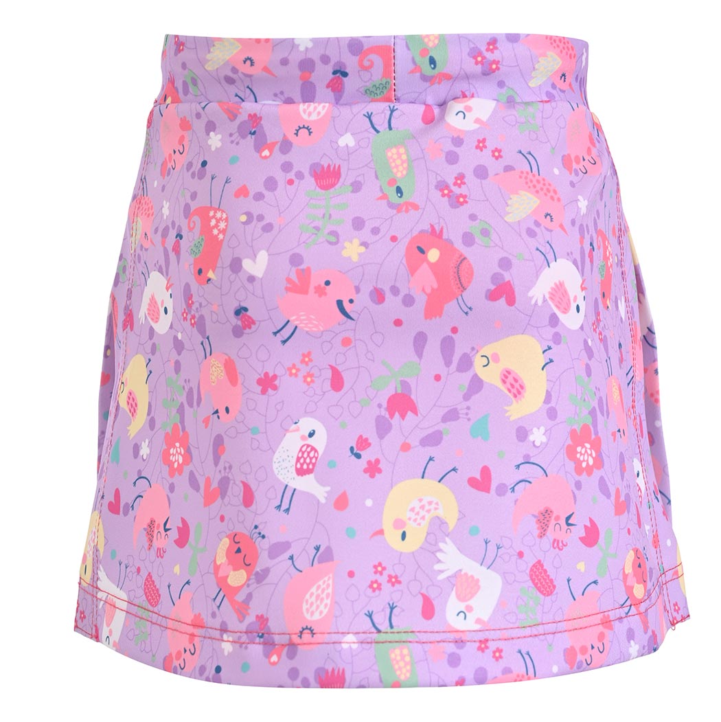 Skort para bebé niña tipo traje de baño, ideal para playa, alberca y juegos acuáticos. Confeccionado en tela de secado rápido, cuenta con pretina elástica con jareta interna, corte en línea A y aberturas laterales que favorecen la movilidad. Incluye calzón interior liso y un tierno estampado de pajaritos en falda y pretina. Detalle de etiqueta bordada con logo que garantiza calidad. Funcional, cómodo y perfecto para el agua.
