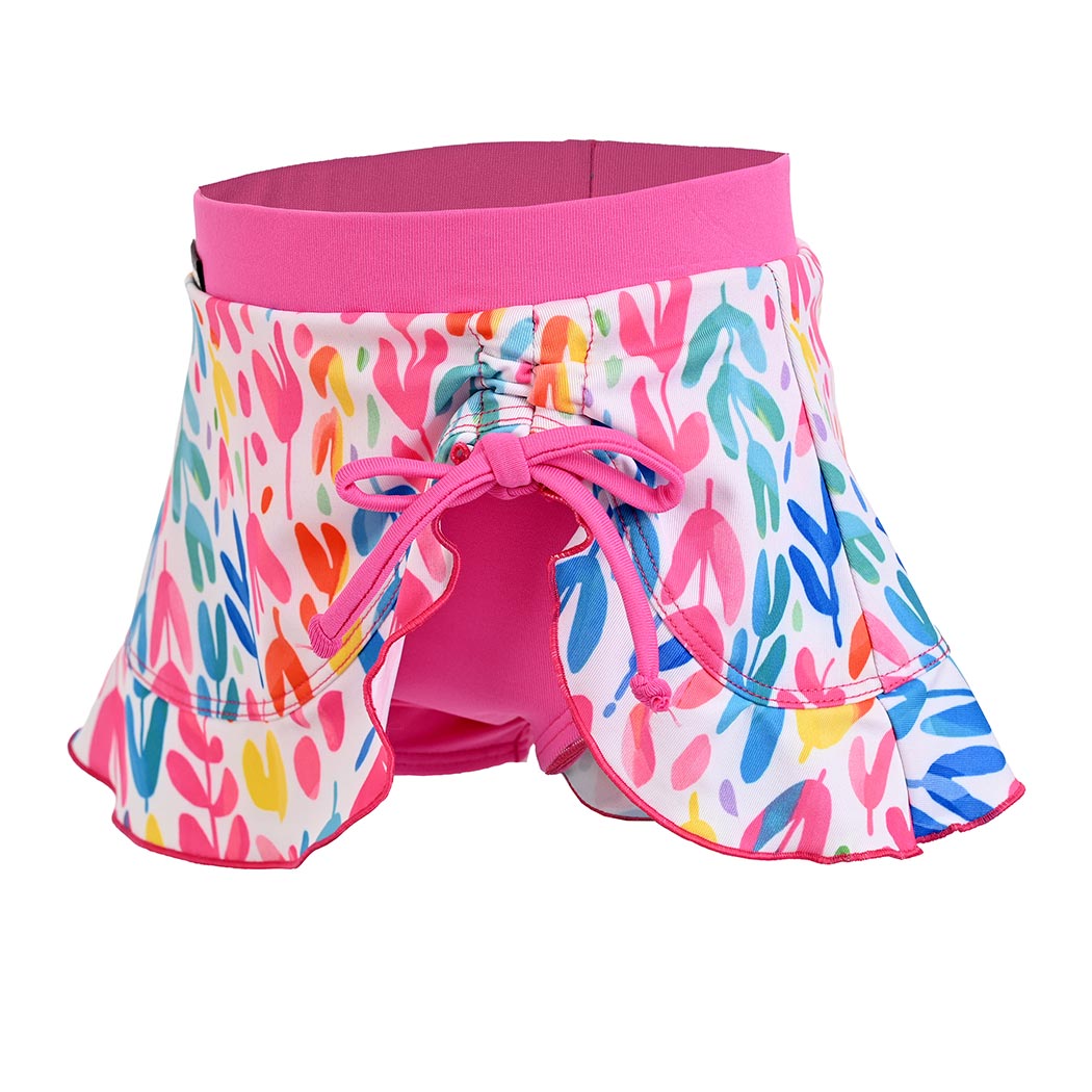 Ideal para los días de playa y vacaciones. Esta skort para bebé niña, cuenta con una pretina elástica con jareta que proporciona un ajuste cómodo y seguro. Su tejido certificado UPF50+ protege del sol, mientras que el secado rápido facilita la transición entre el agua y la arena. Presenta un corte asimétrico tipo pareo con un estampado colorido en el faldón y olan en el ruedo que aporta frescura y estilo. La pretina y el calzón lisos equilibran el diseño, y el ajustador frontal permite modificar el largo del faldón para mayor comodidad. La etiqueta tab bordada añade un detalle de calidad y autenticidad.