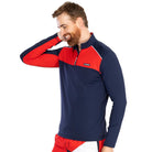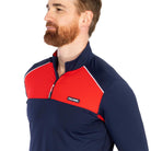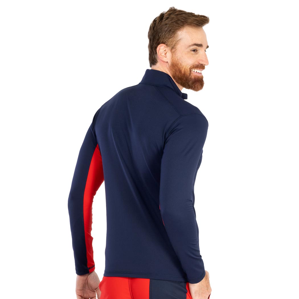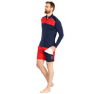 Para los días de vacaciones o descanso te recomendamos esta Wet de caballero con cierre al pecho, en color marino, con pecho en color rojo y detalles en color blanco, con mangas inferiores en color rojo, cuenta con etiqueta bordada con nuestra certificación UPF50+ que mantiene protegida tu piel de los rayos solares, confeccionada de tela fresca, suave y ligera que no guarda olores, es de secado ultra rápido y también recomendada para actividades acuáticas.