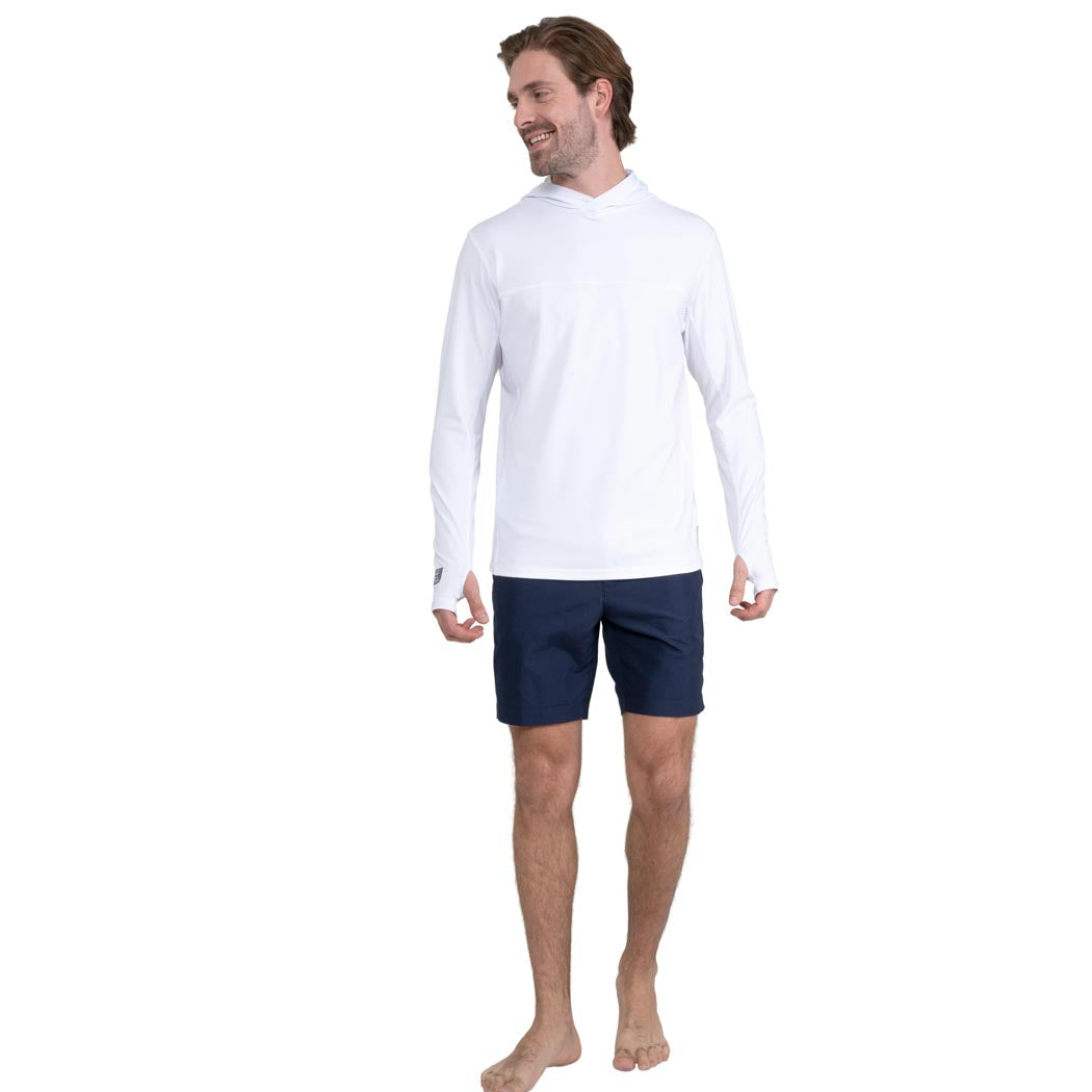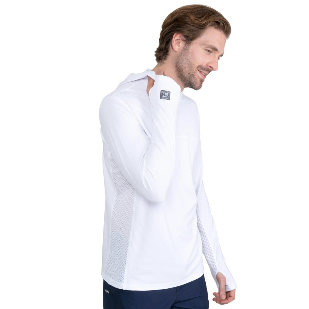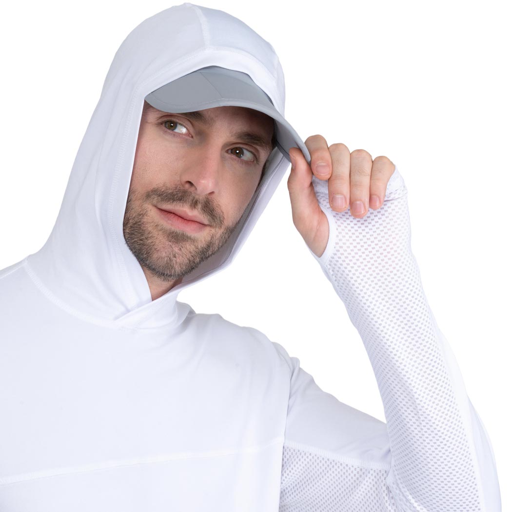 Hoodie en color blanco para caballero, con manga larga, capucha y perforación en manga para pulgar, de amplia cobertura, ya que esta prenda cuenta con nuestra recomendación UPF50+ que mantendrá tu piel protegida de los rayos solares, mientras usas esta prenda, te mantendrás fresco y relajado, ya que esta confeccionada con tela suave y ligera, de secado ultra rápido, que no guarda olores.